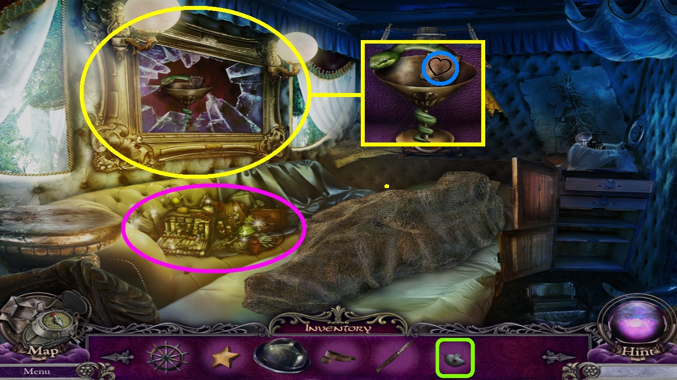- Pick the mirror shard (yellow square) from the inventory; use it to cut the necklace and take the pearl (as shown in the blue square).