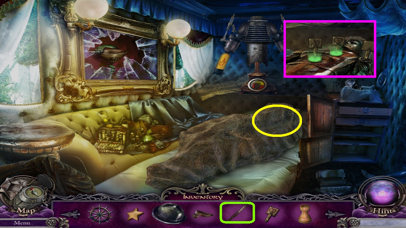 - Use the knife in the inventory to cut the red cloth (purple circle).