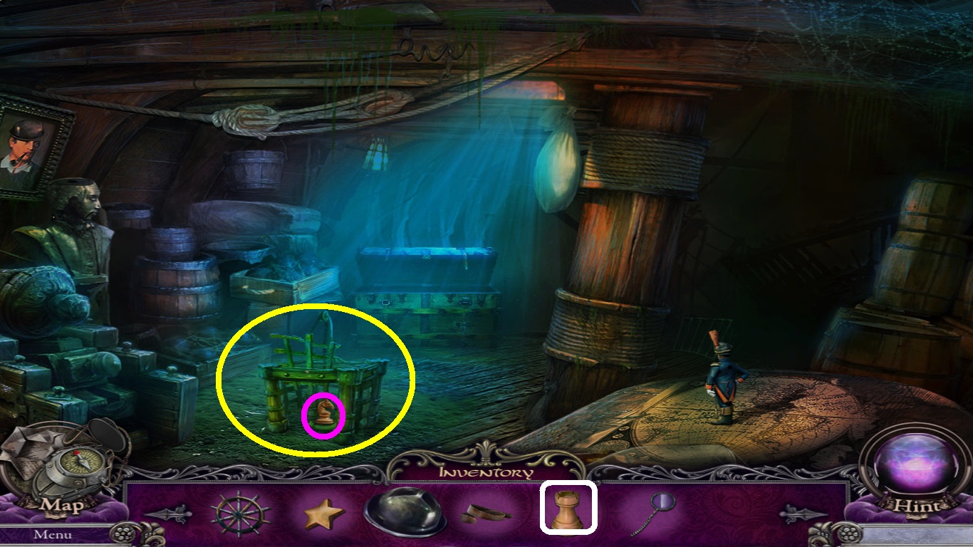 - Select the ship wheel (white square) from the inventory; place it on the control, use it to open the stall.
