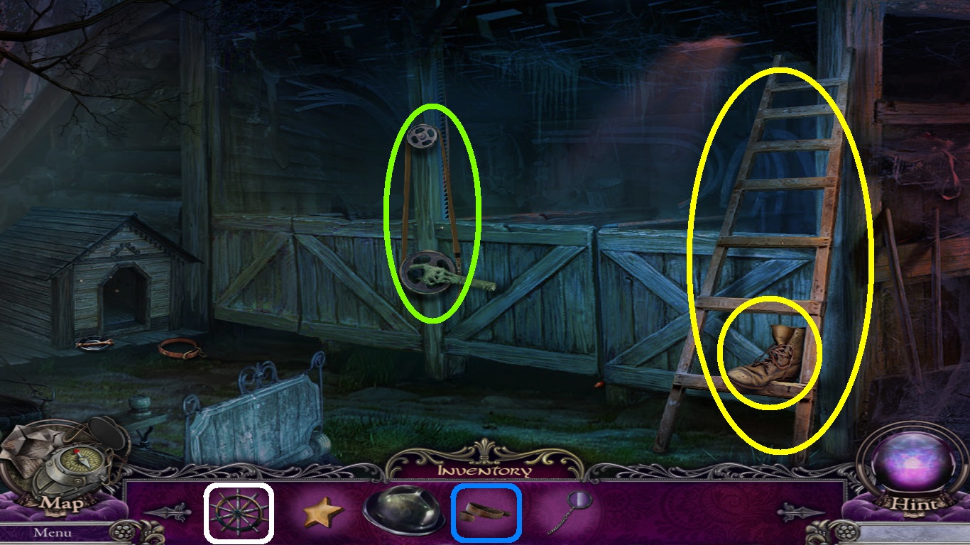 - Pick up the boot and the ladder (yellow circles).