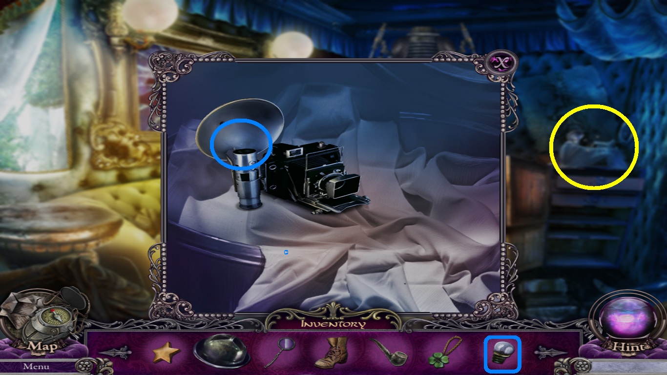- Select the bulb (blue square) from the inventory; place it into the flash (blue circle) and pick up the camera.