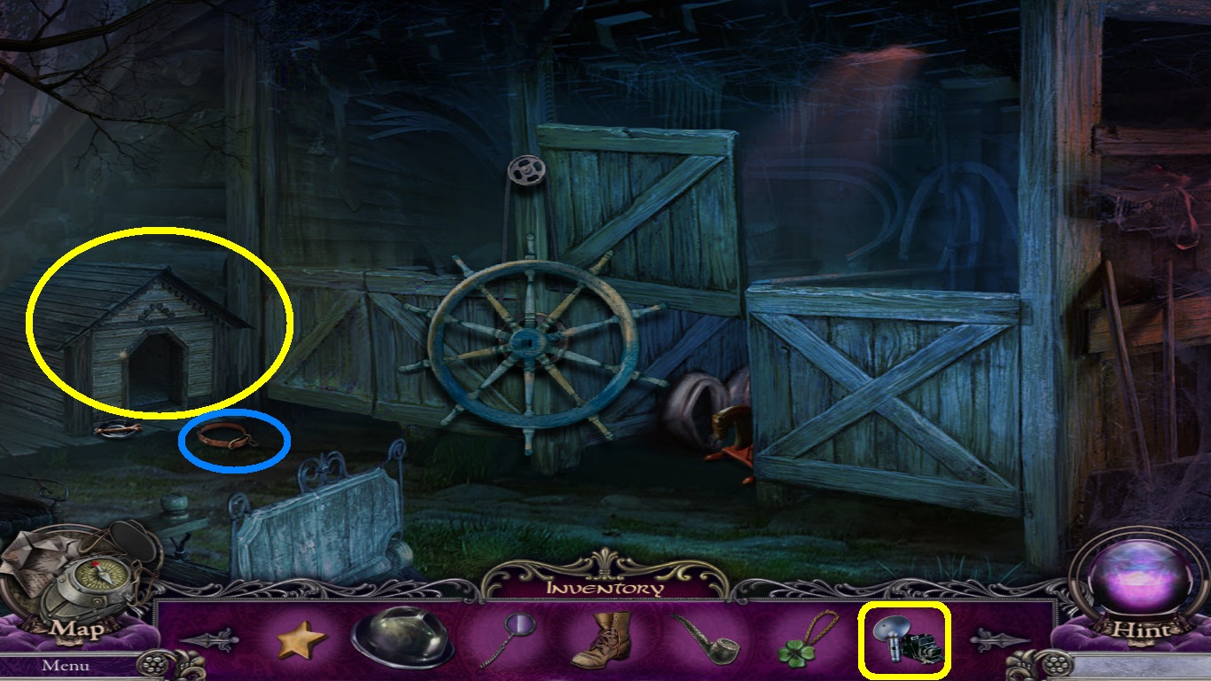 - Select the camera (yellow square) from the inventory; place it in front of the doghouse, take a picture.