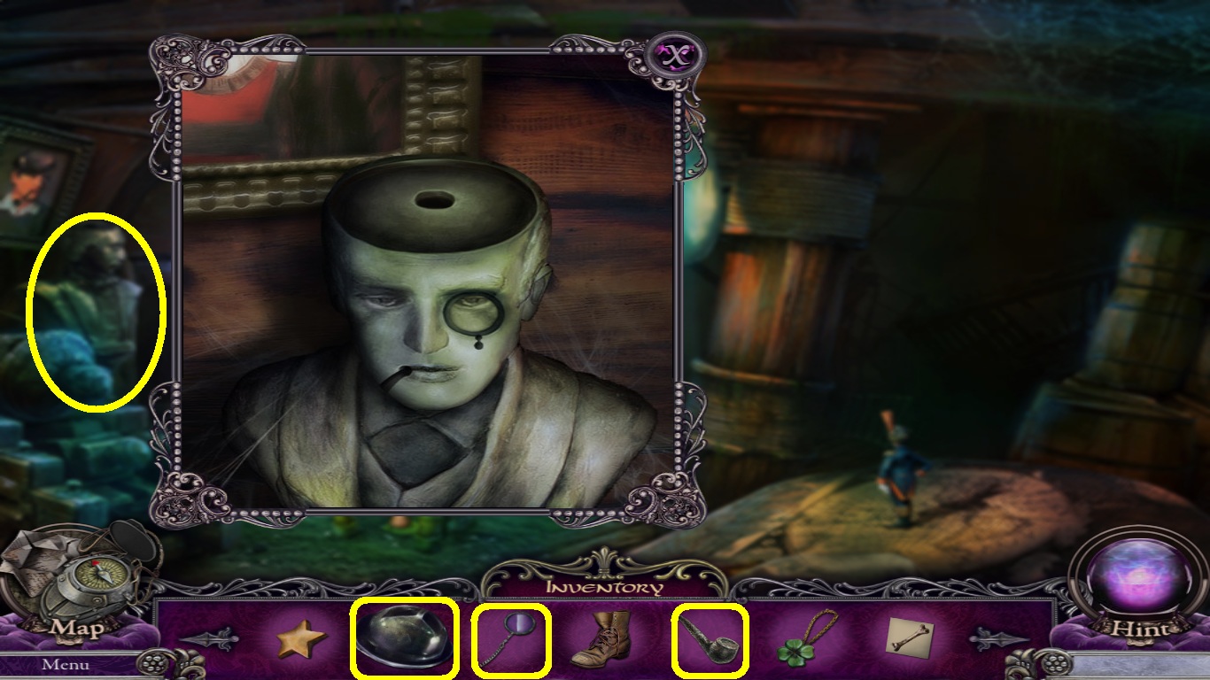 - Select the stone pipe, monocle and hat (yellow squares) from the inventory; place them onto the statue.