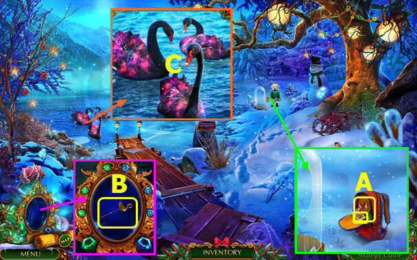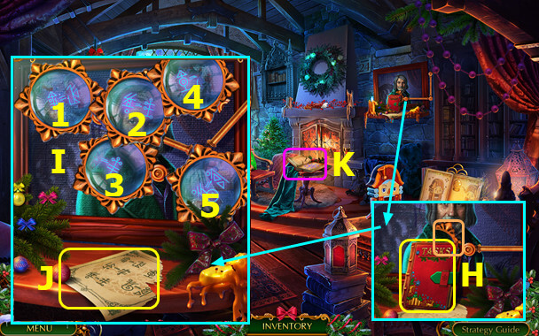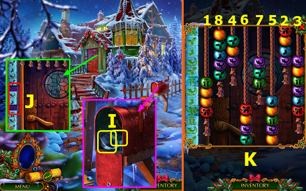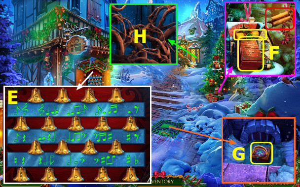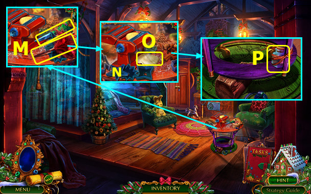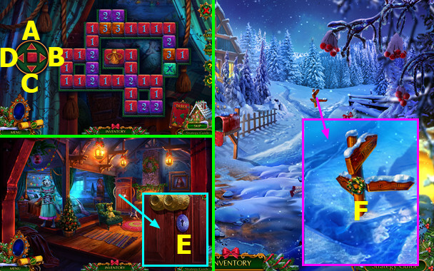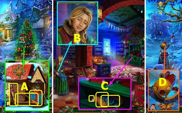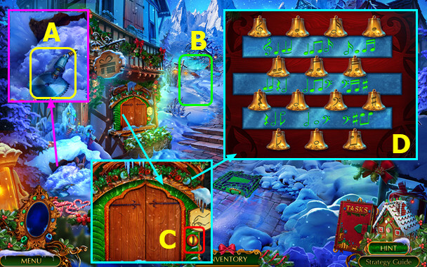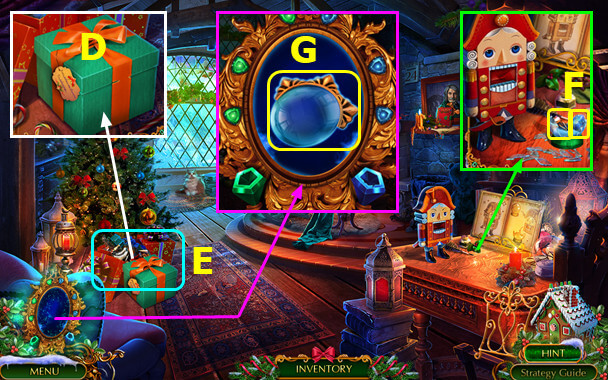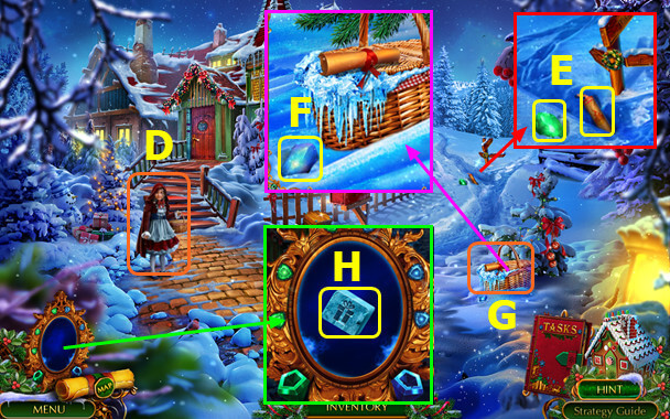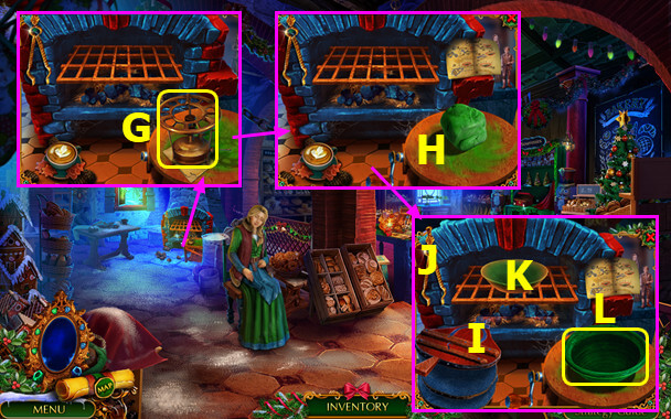 - Select gingerbread house; take PLIERS and 1st MAGIC CRYSTAL (B).