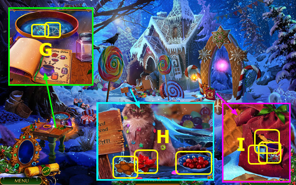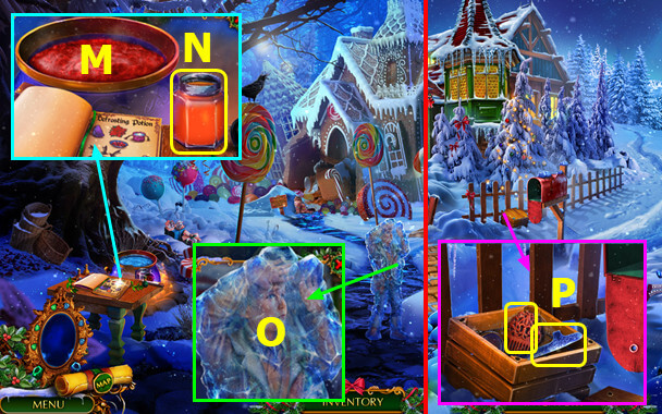 - Place HOLLY BERRIES, POINSETTIA, POWDERED SUGAR, and COAL (M); take DEFROSTING POTION (N).