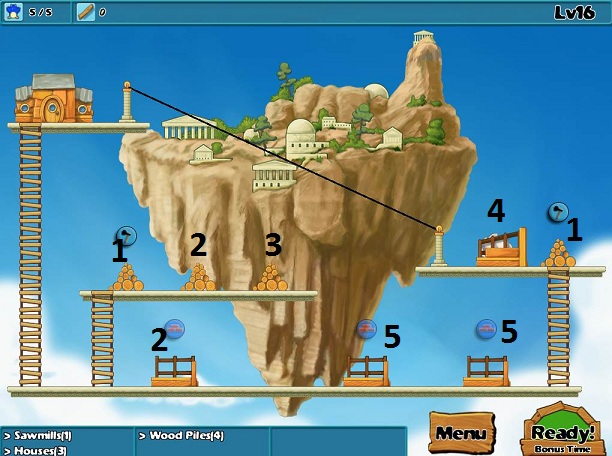 - Build house with 2 workers and clear 2 wood piles with 3 workers
