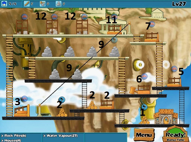 Goals: 6 rock piles, 4 houses, 27 water vapour