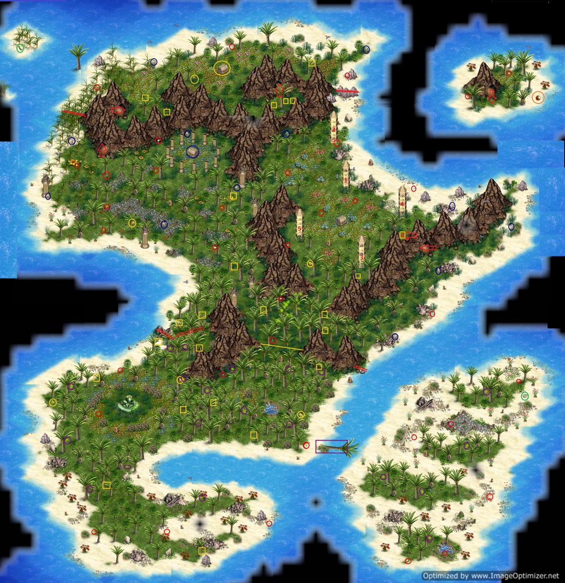 - In the central northern section, there is another lighted tunnel hidden by a tree (see red arrows) that will take you to an island in the northeast. Plant your eye flag in the door and as soon as you move through it, plant it on the island; otherwise you will pop back and forth.
