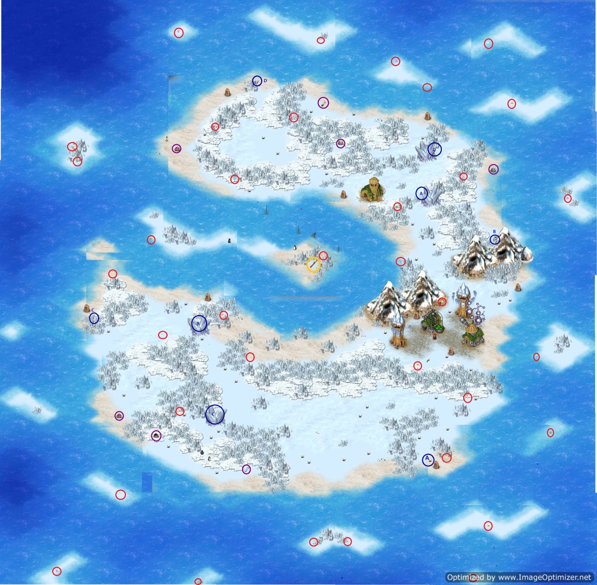 - Work your way north. The ice blockages need have a missing piece found to remove them. They are hard to see and each shard is unique to an ice blockage. They are circled in blue on the map with a letter to match it to the ice blockage.