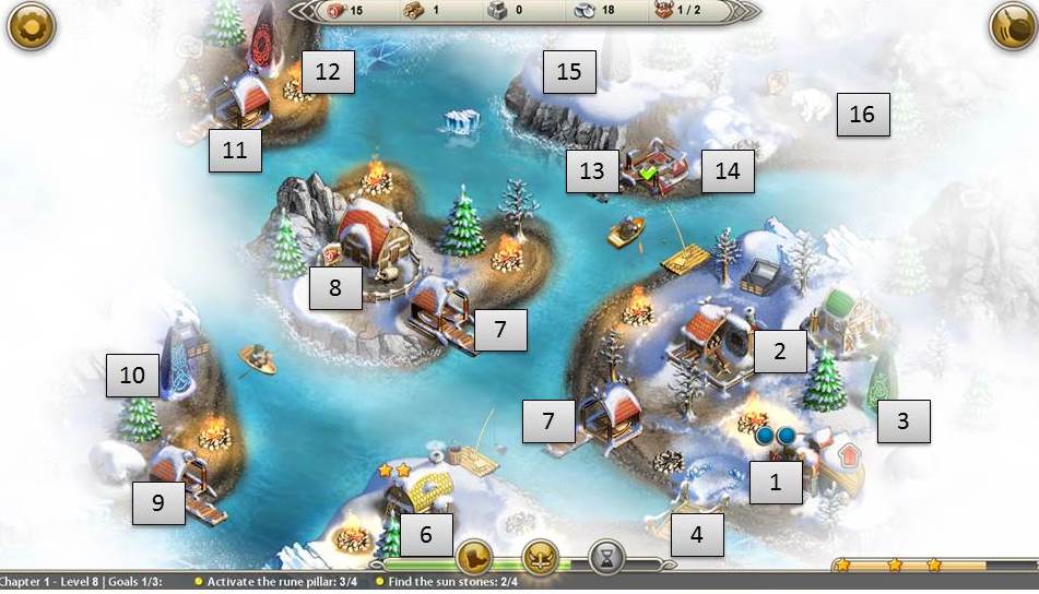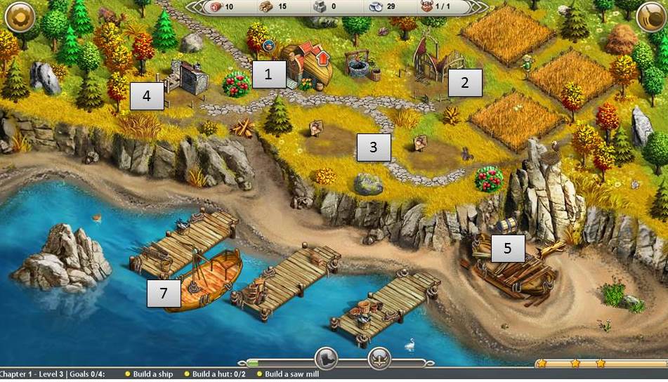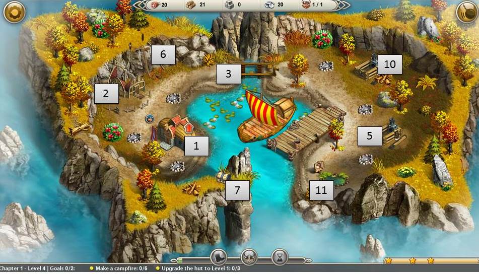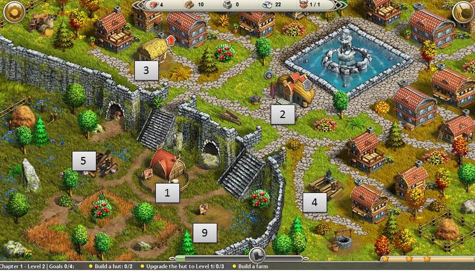 - Build 2 huts and upgrade