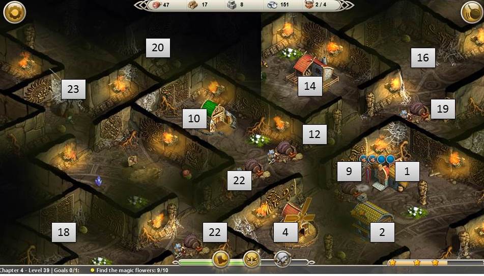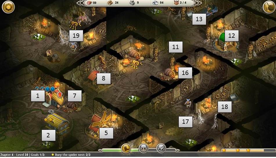 - Clear 2 spider and queen spider on the right; queen spider takes 20 food and 20 silver