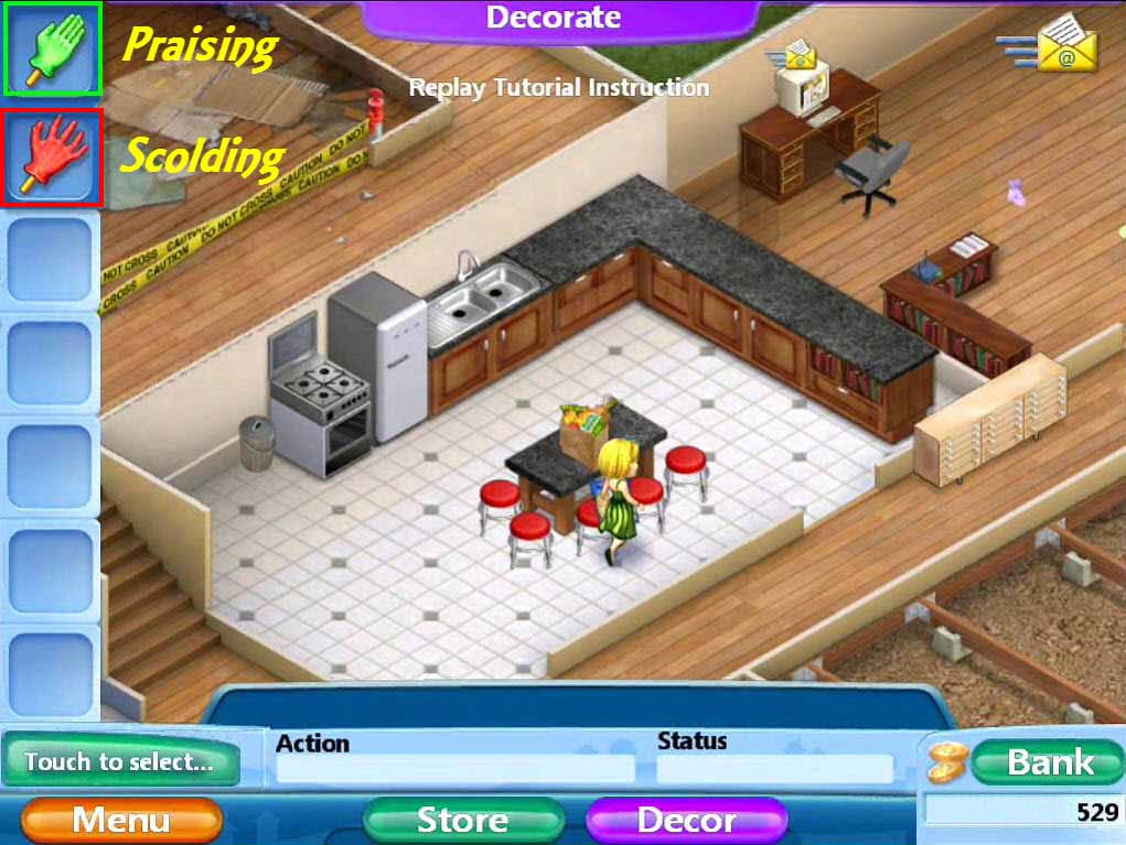 - To shape your little people's behaviors you need to use the scolding and the praising gloves found in the upper left corner of your screen.