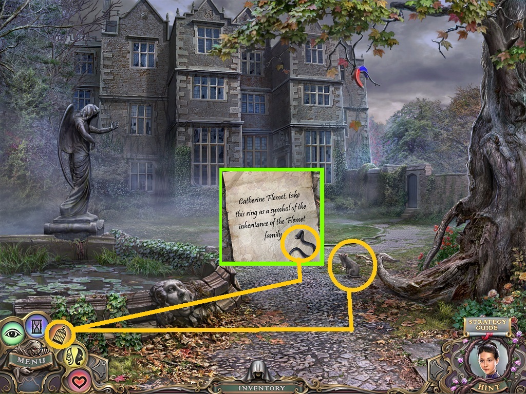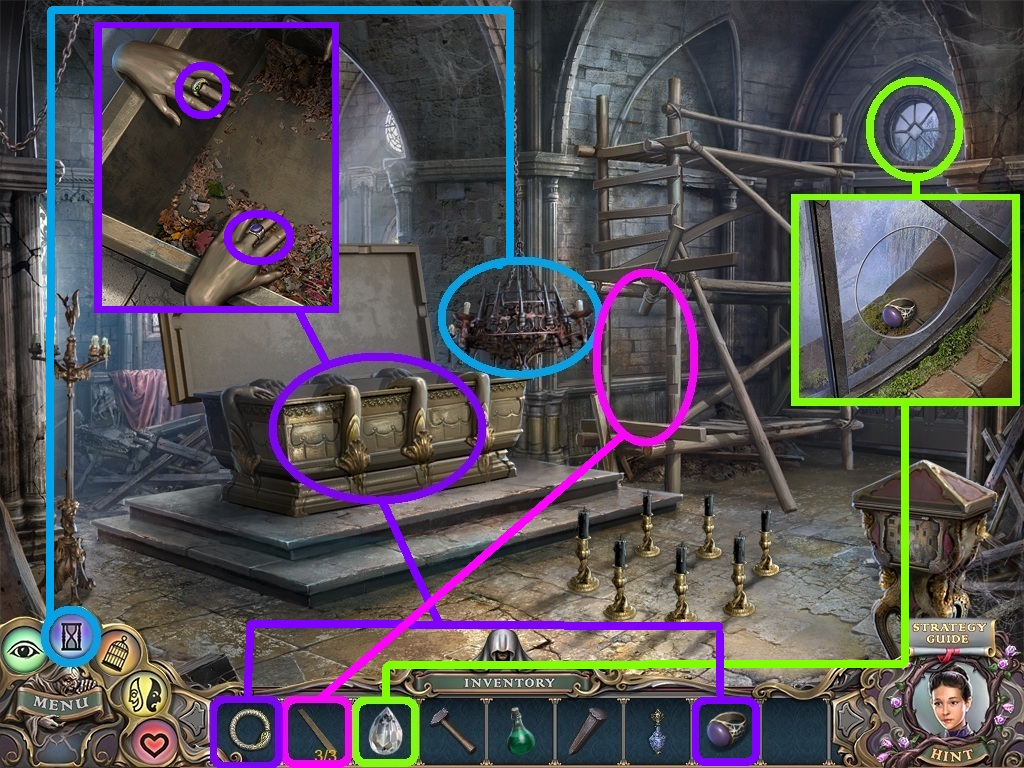 - Pick the magnet (green square) from the inventory; use it to magnetize the ring (green circle).