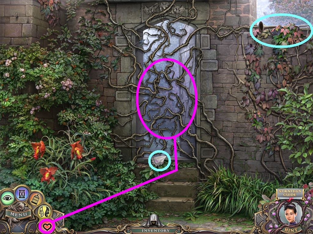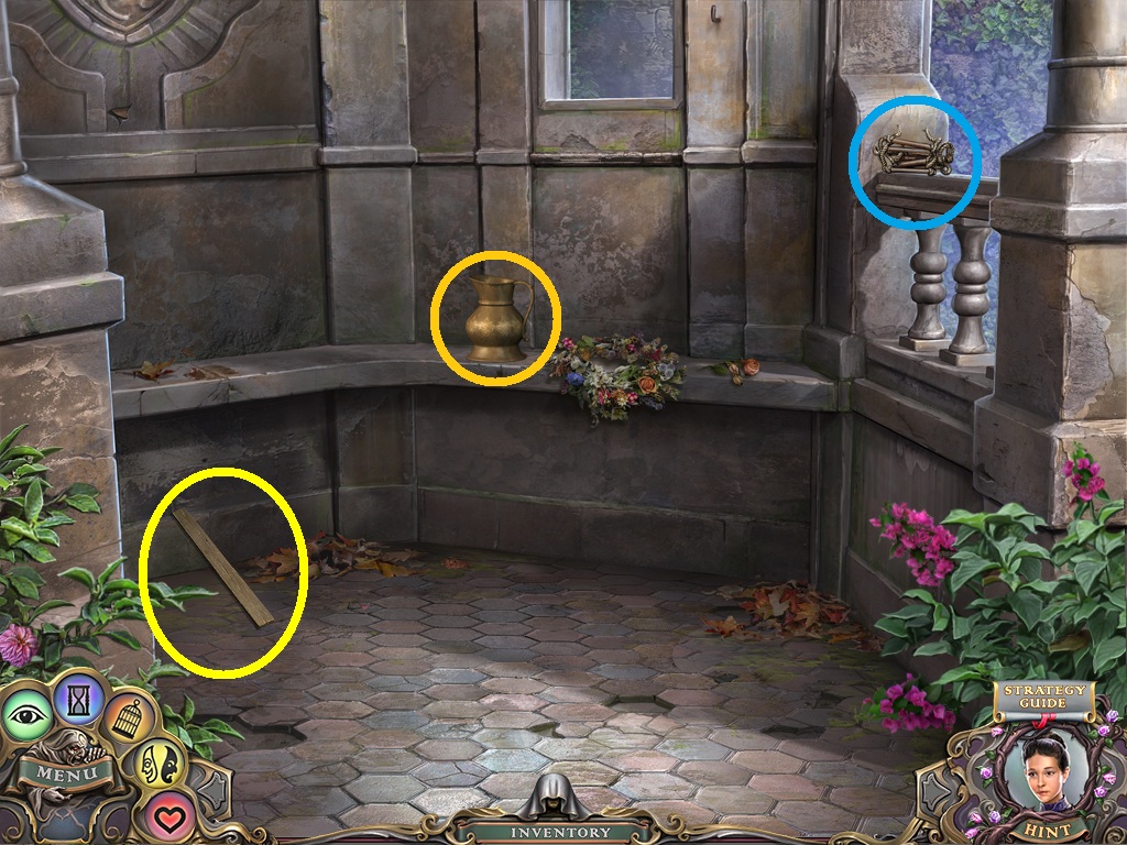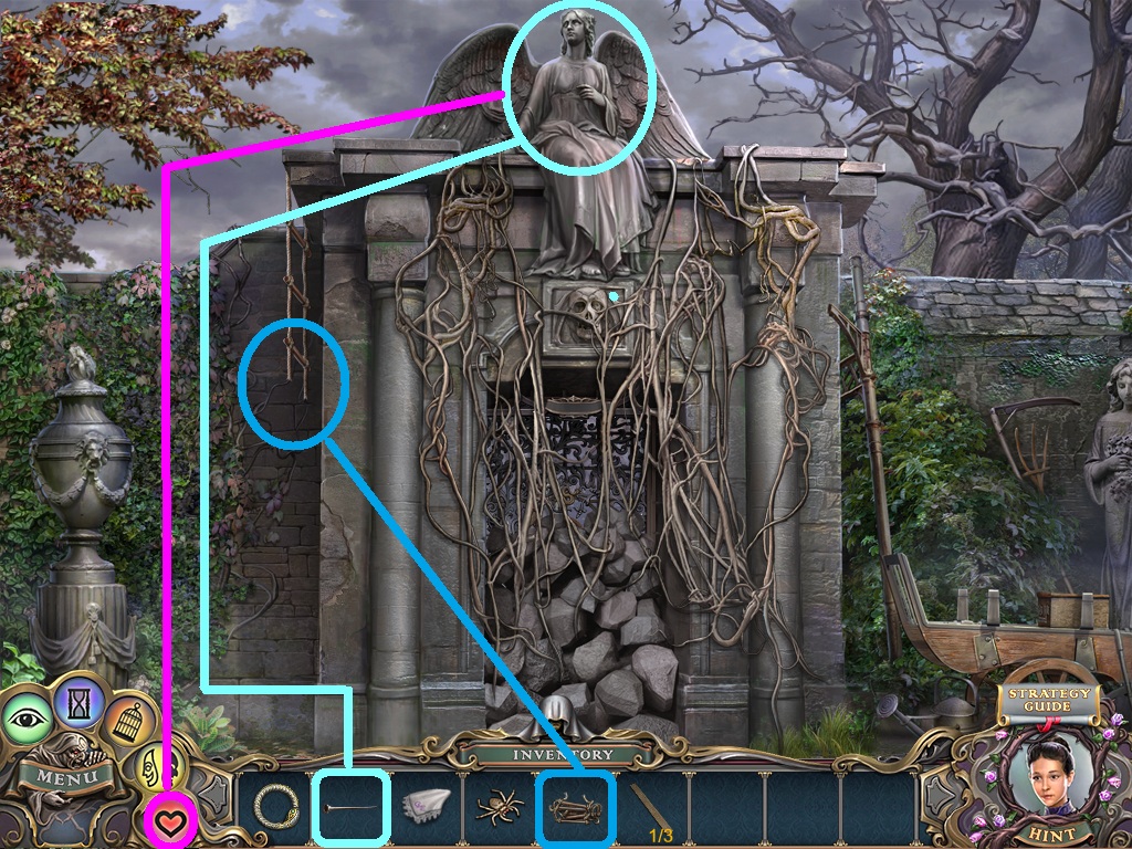 - Pick the trumpet (aqua square) from the inventory; place it into the statues hands.