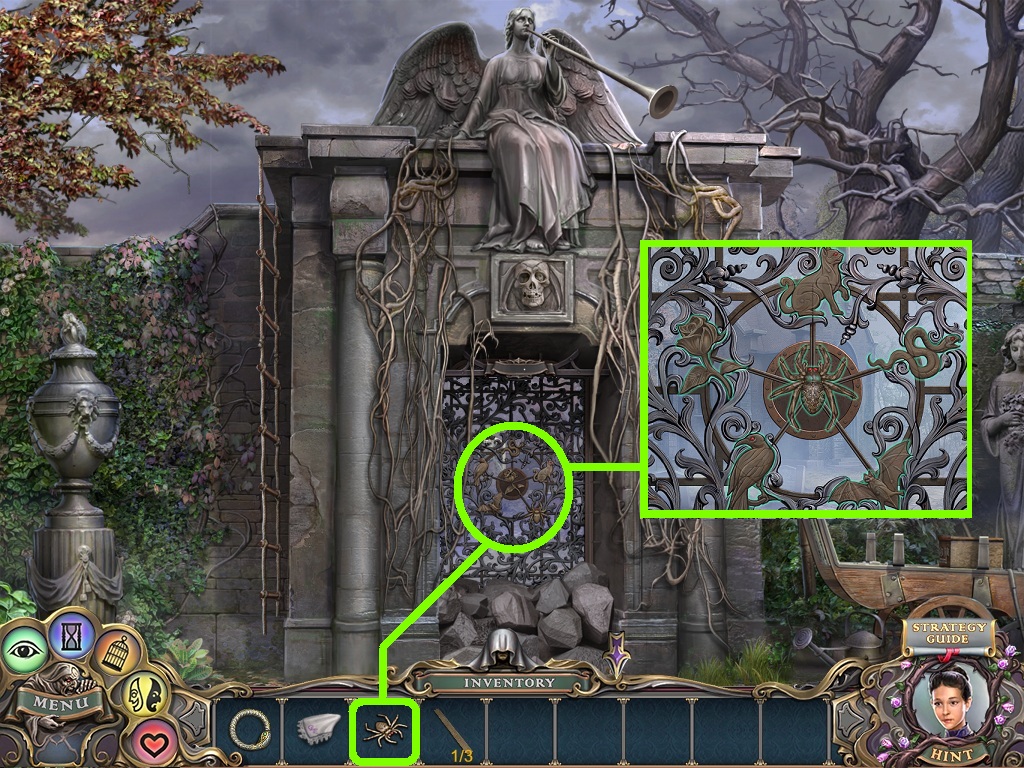 - Pick the spider (green square) from the inventory; place it into the lock.