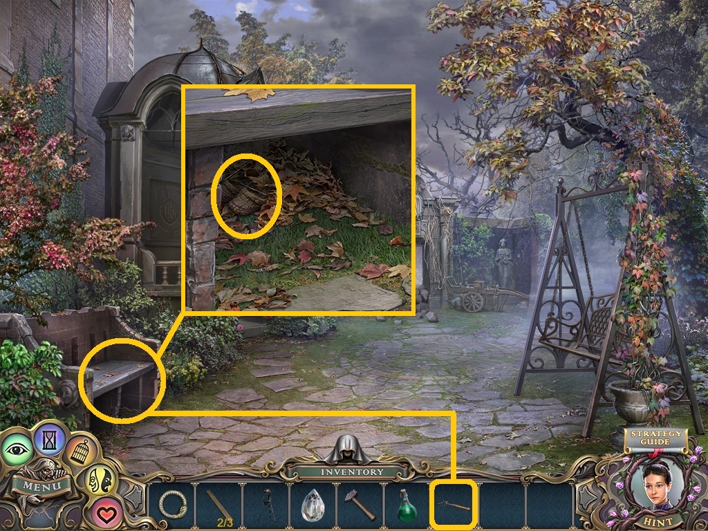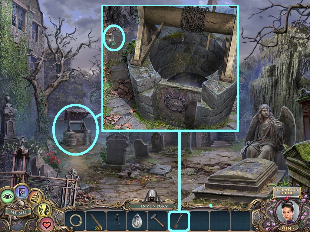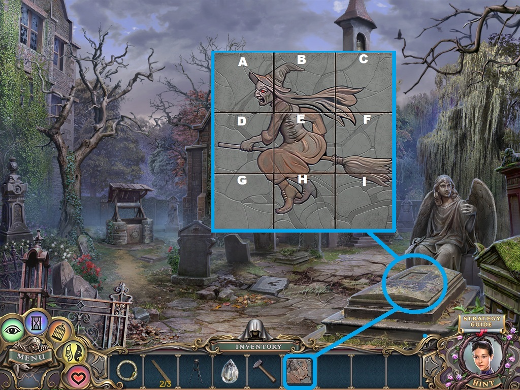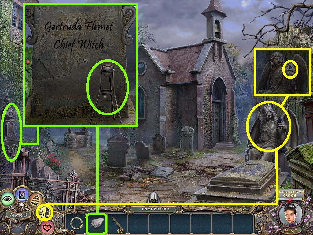 - Pick the handkerchief (green square) from the inventory; use it to clean the gravestone.