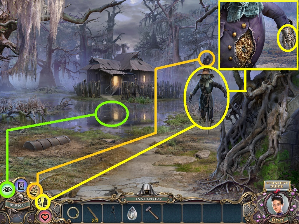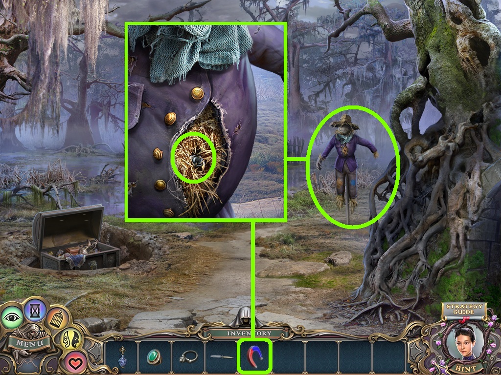 - Select the turn good power (yellow circle); zoom into the scarecrow and use it.