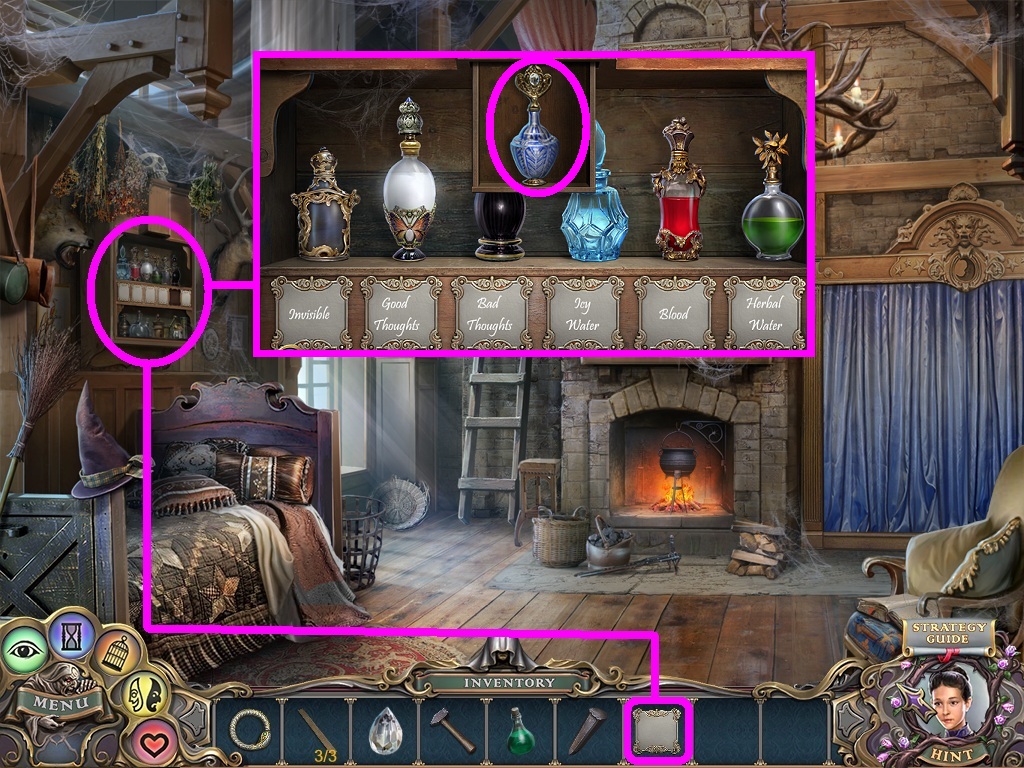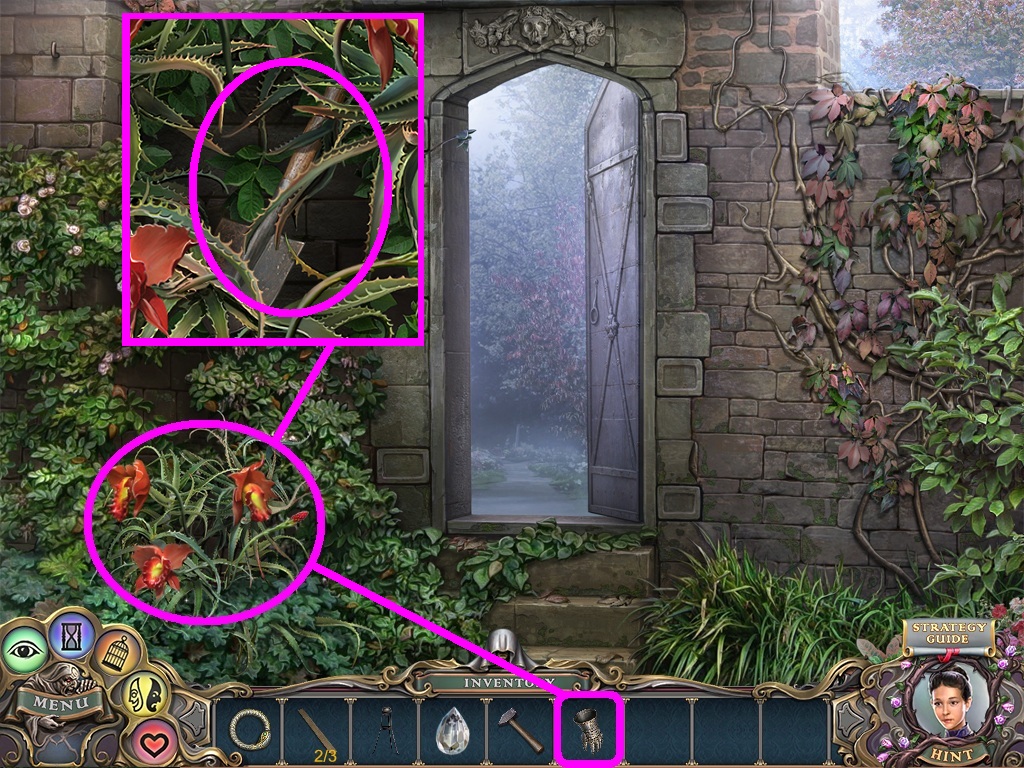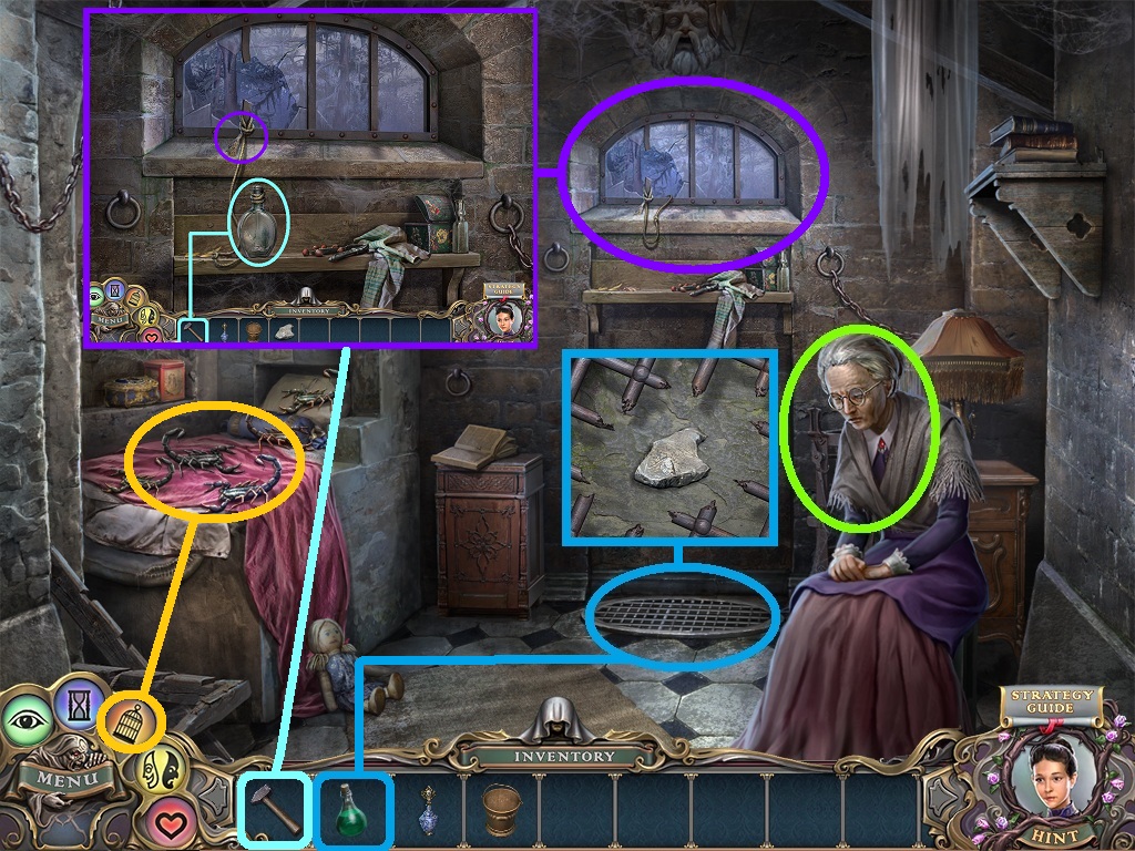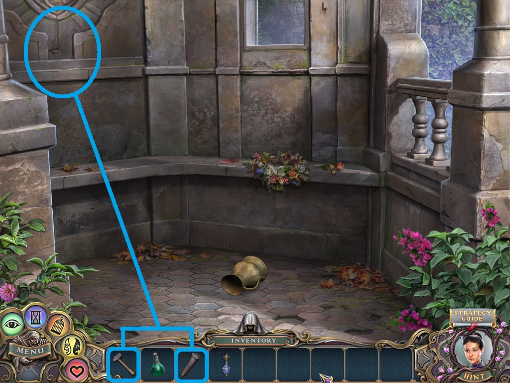 - Pick the hammer (aqua square) from the inventory; use it to break the bottle.
