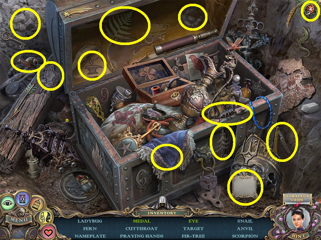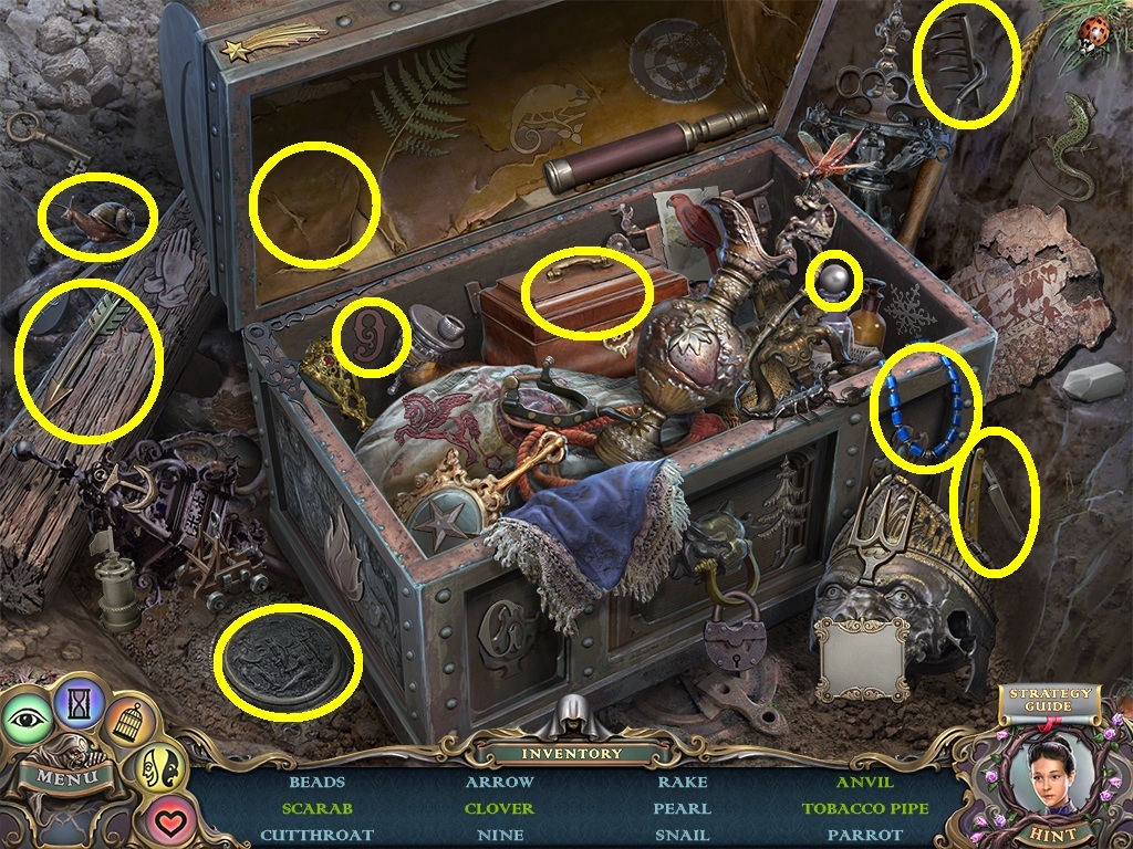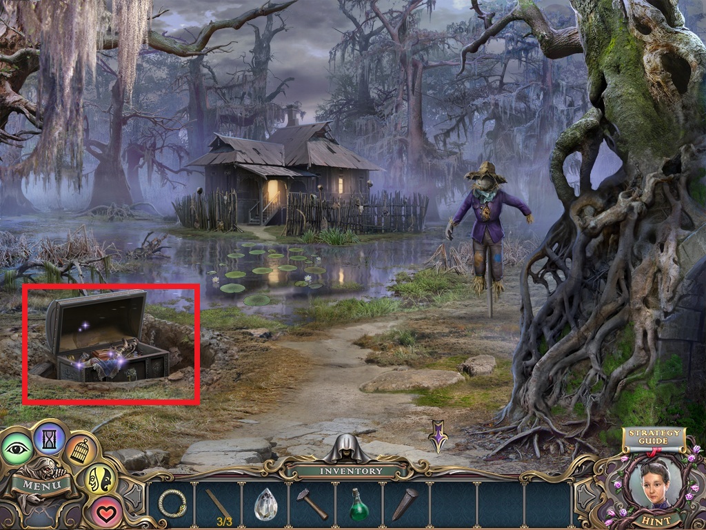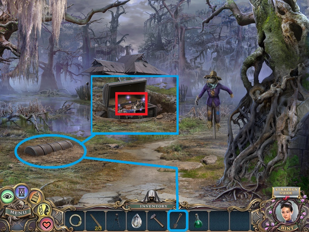- Pick the shovel (blue square) from the inventory; use it to dig up the chest (blue circle).