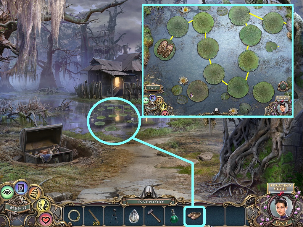 - Pick the bast shoes (aqua square) from the inventory; place them on the lily pad.