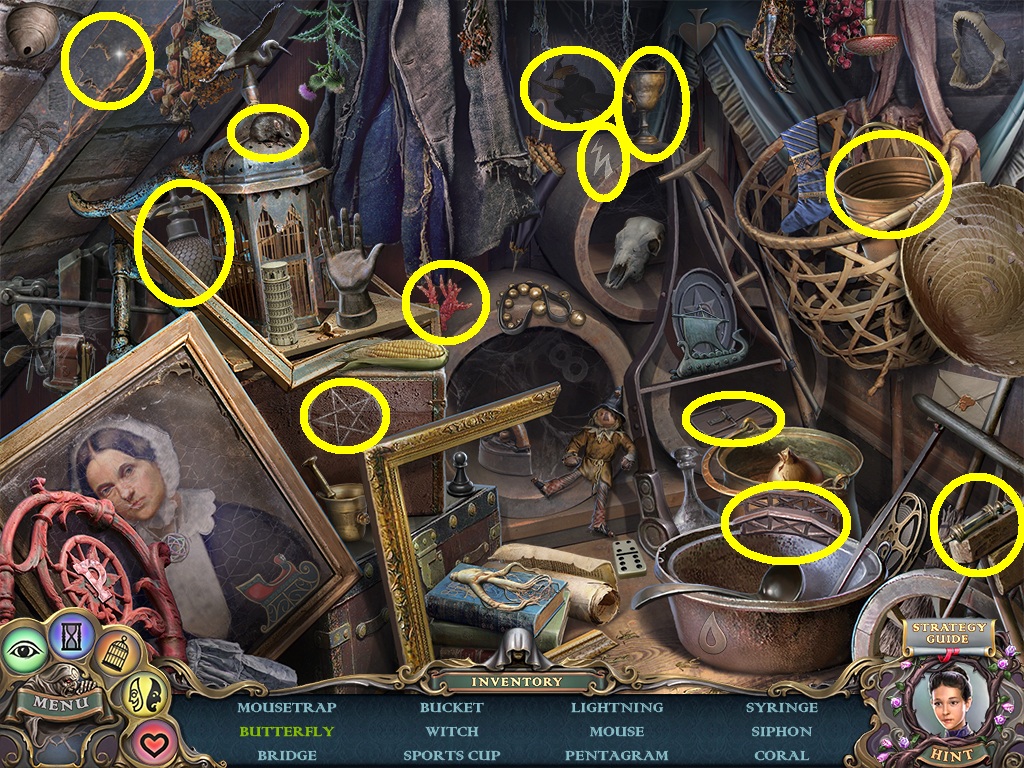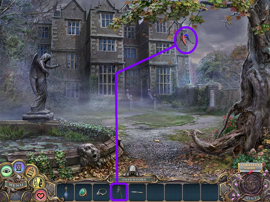 - Pick the butterfly net (purple square) from the inventory; use it to collect the magnet (purple circle).