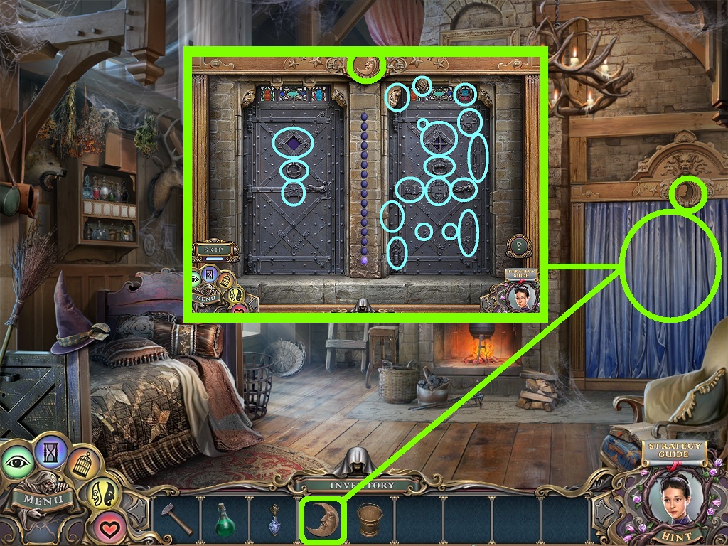 - Pick the moon (green square) from the inventory; place it into the open groove (green circle).