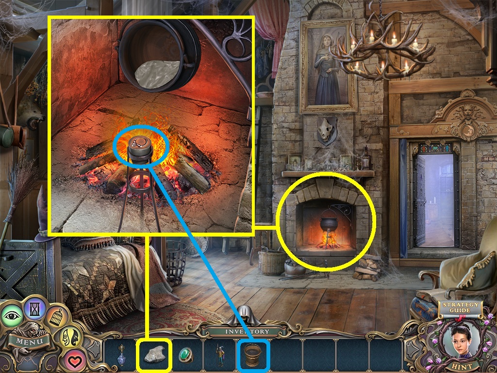 - Zoom into the fireplace (green circle); collect the board (green circle).
