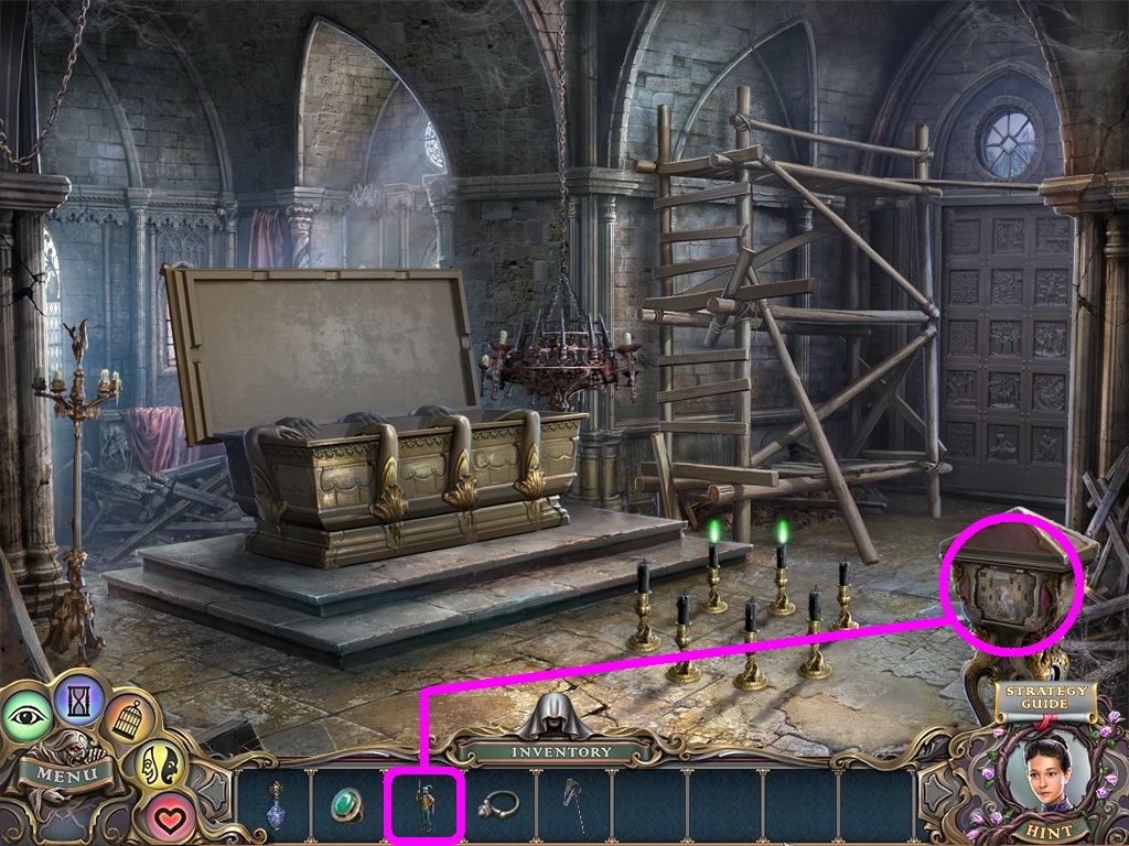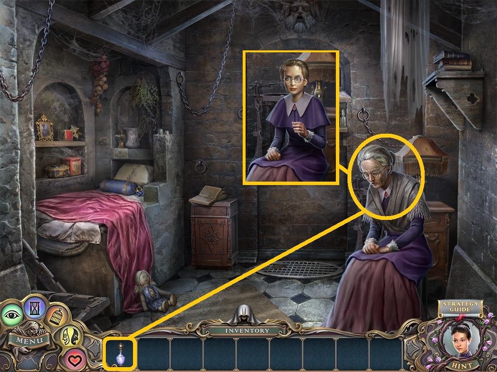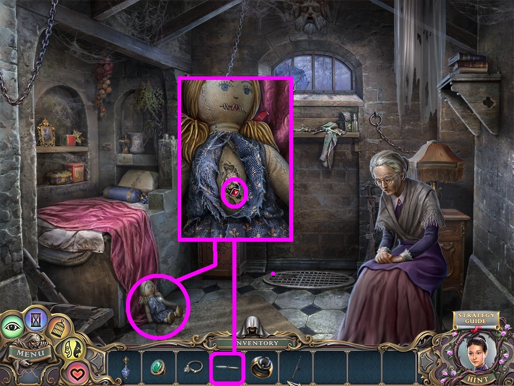 - Pick the dagger (pink square) from the inventory; cut the doll open.