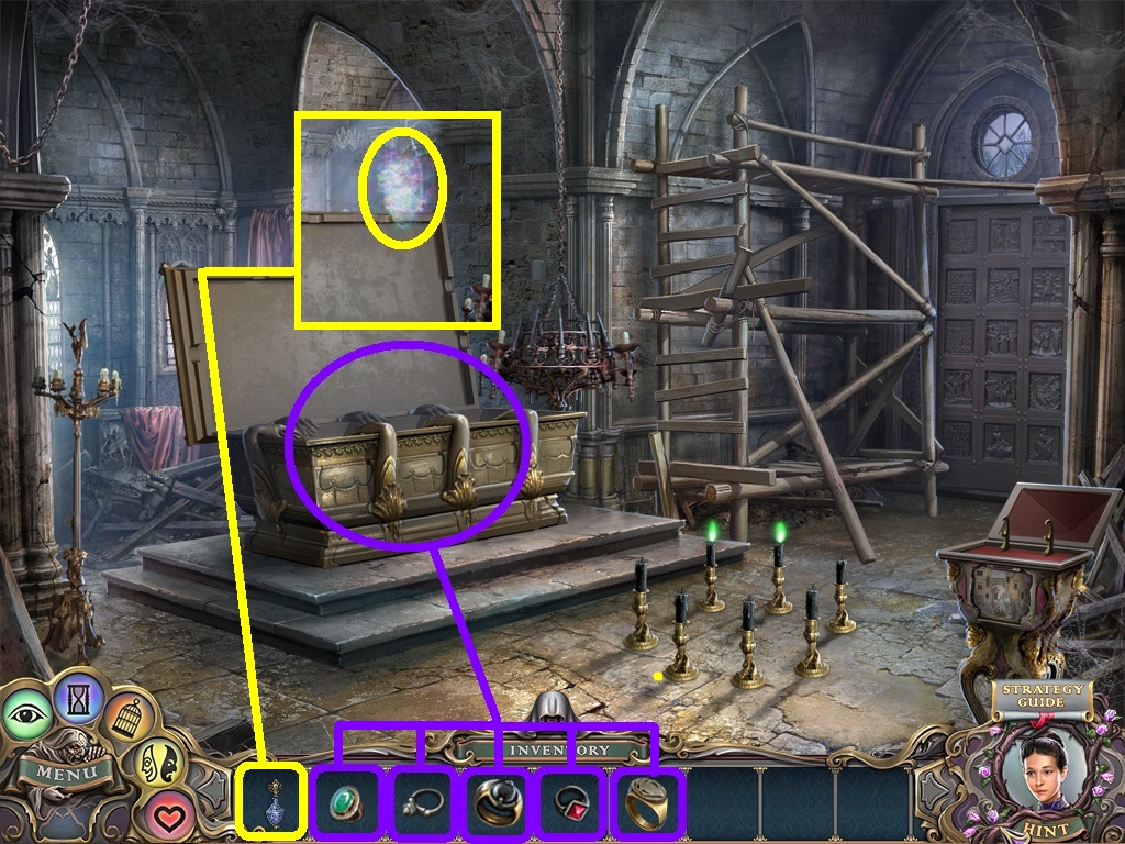- Pick the rings (purple squares) from the inventory; use them on the hands (purple circles).