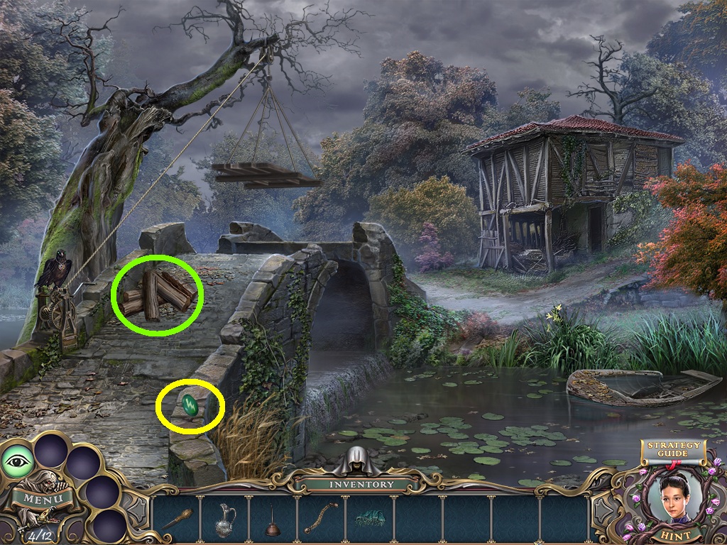 - Pick the matches (green square) from the inventory; light the firewood (green circle) with them.
