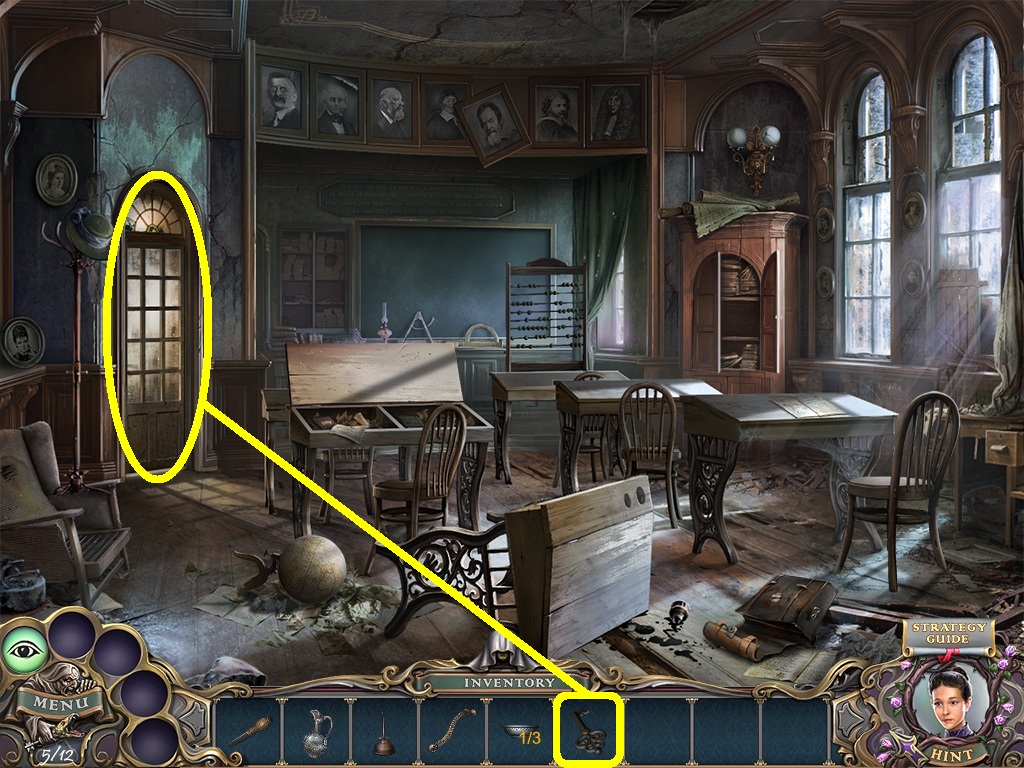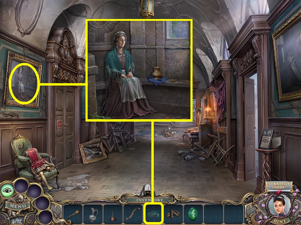 - Pick the shawl (yellow square) from the inventory; give it to the woman in the painting.