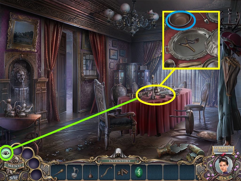 - Click the reveal power (green circle); use it on the table and zoom into the table setting (yellow circle).