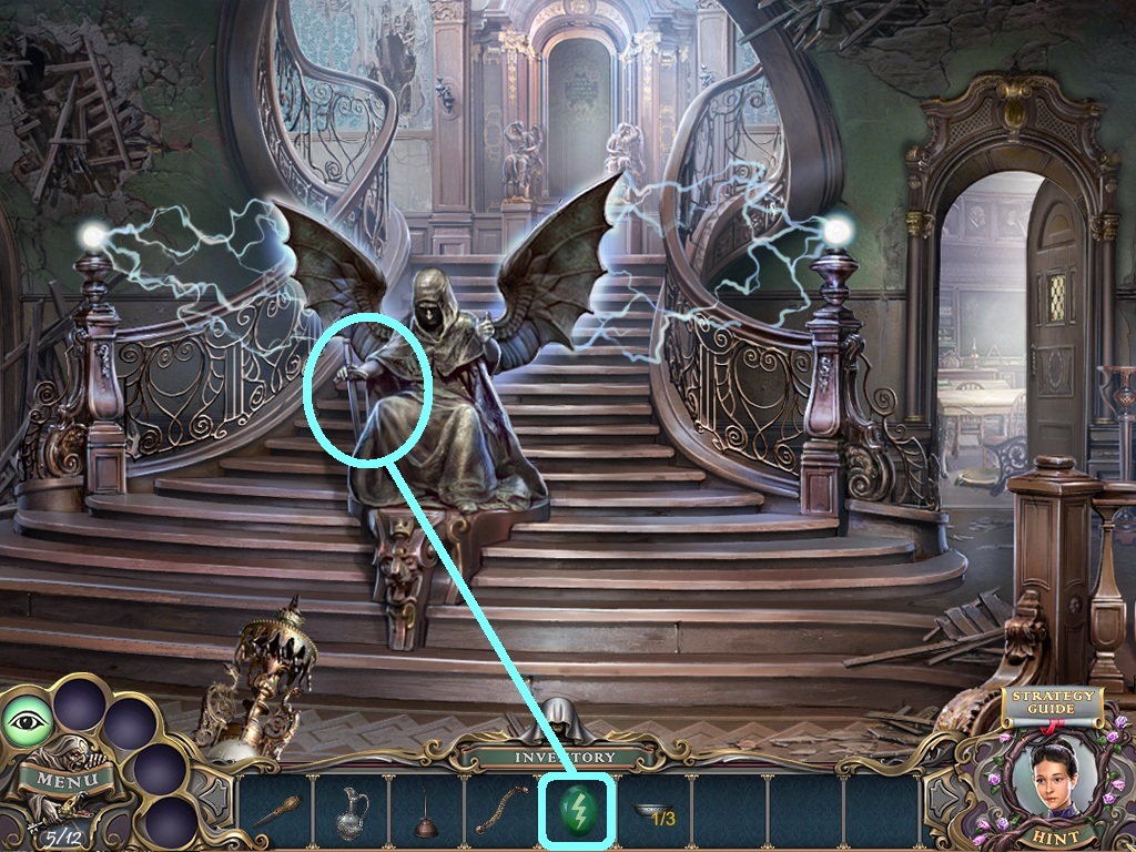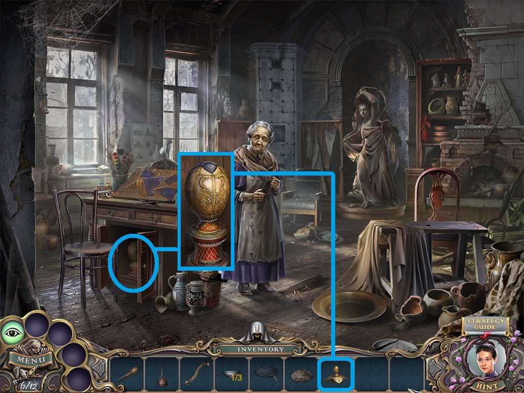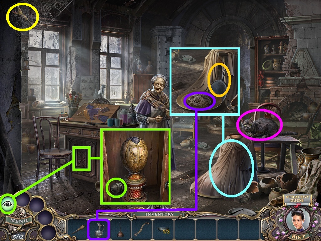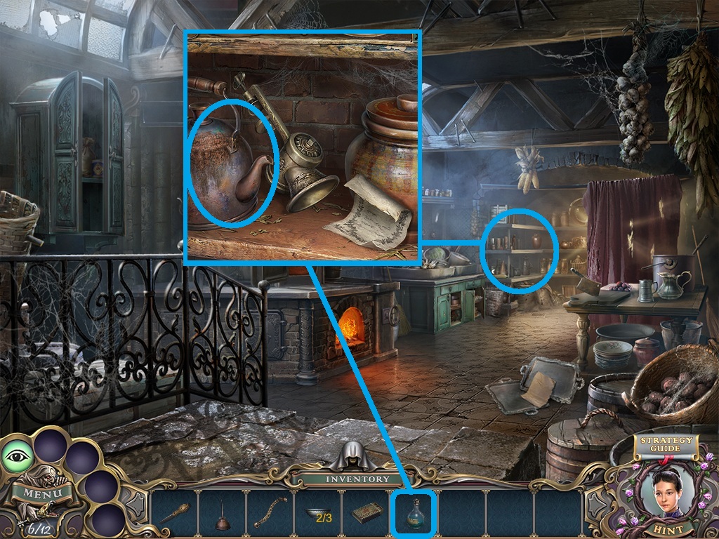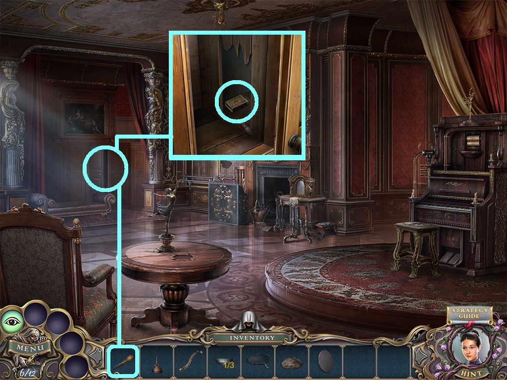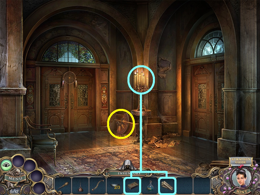 - Pick the candles (aqua square) from the inventory; put them into the candelabra (aqua circle).