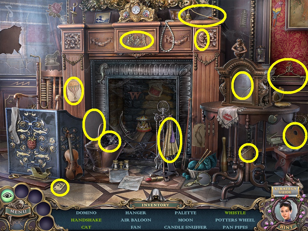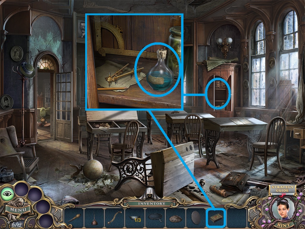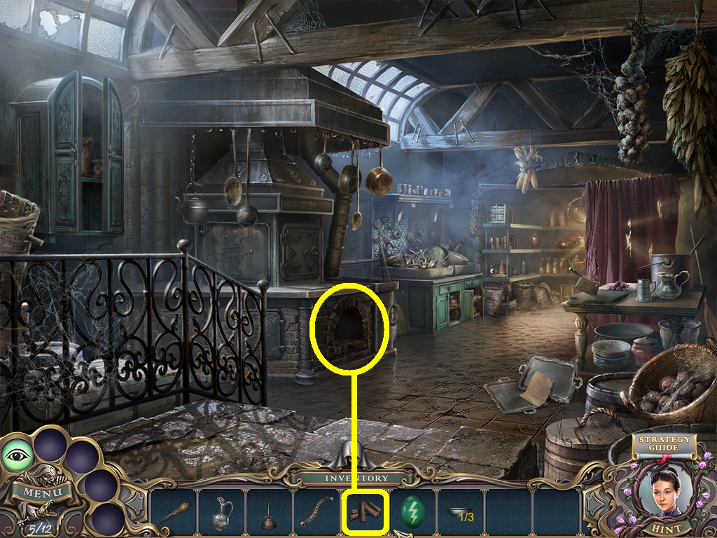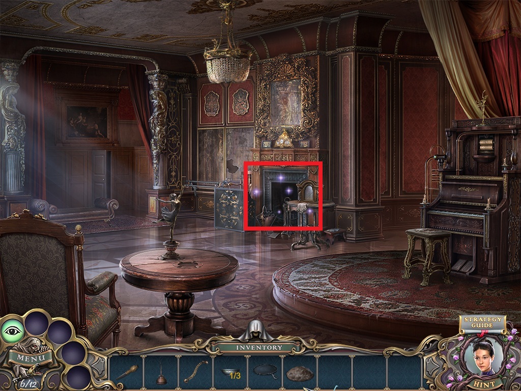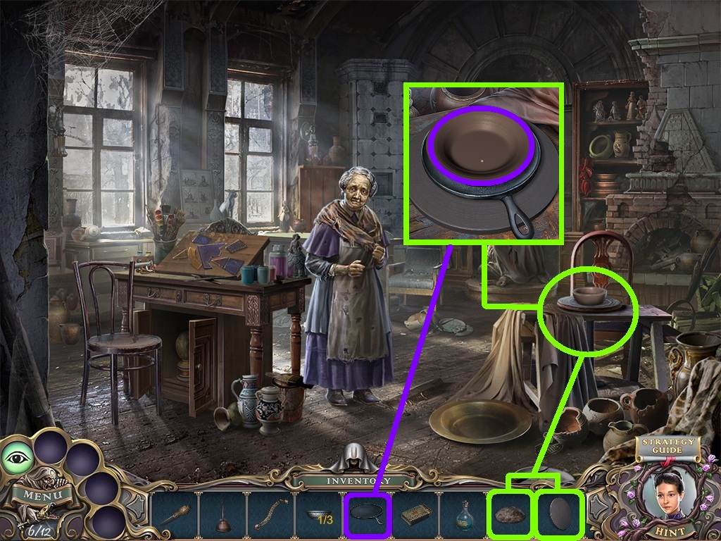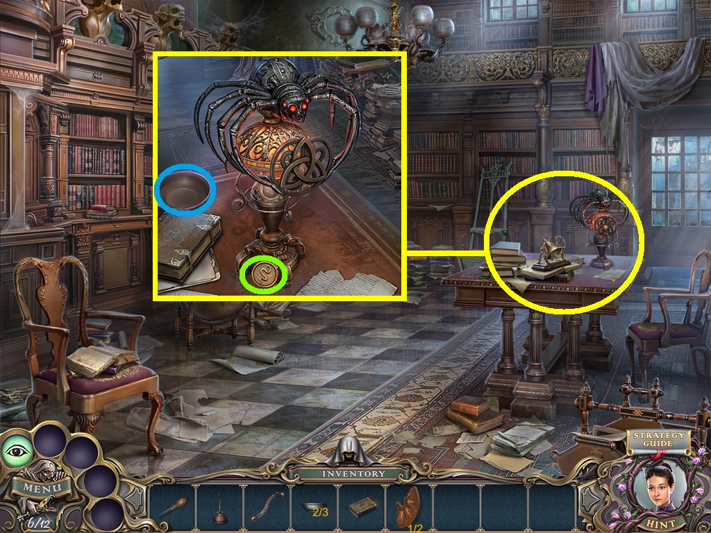 - Pick the candles (aqua square) from the inventory; put them into the candelabra (aqua circle).