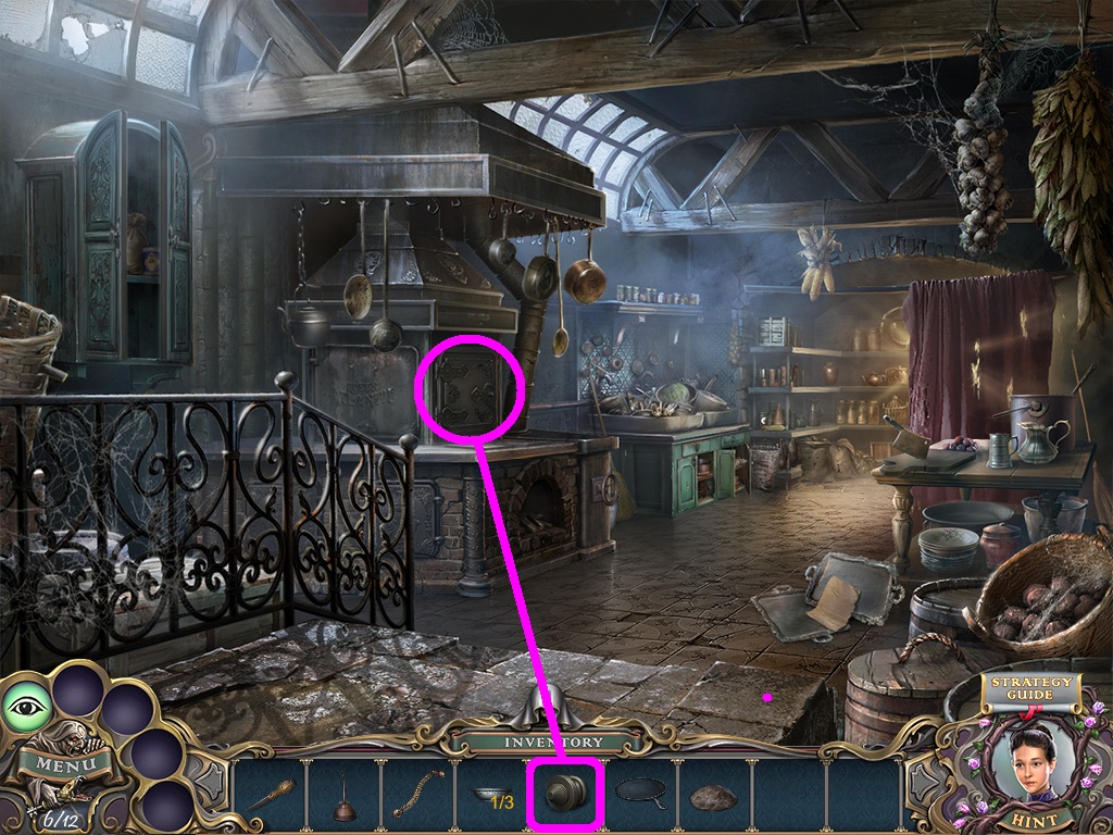 - Pick the oven handle (pink square) from the inventory; zoom into the oven and place the handle on the door (pink circle).