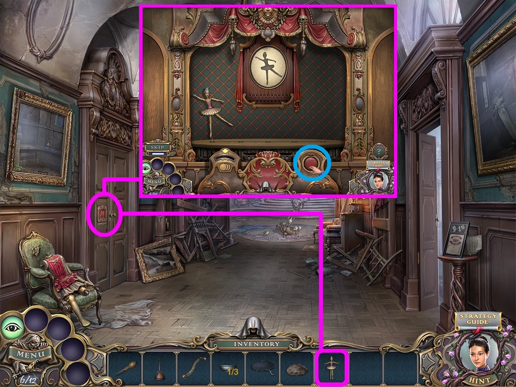 - Pick the ballet dancer (pink square) from the inventory; insert it into the door lock.