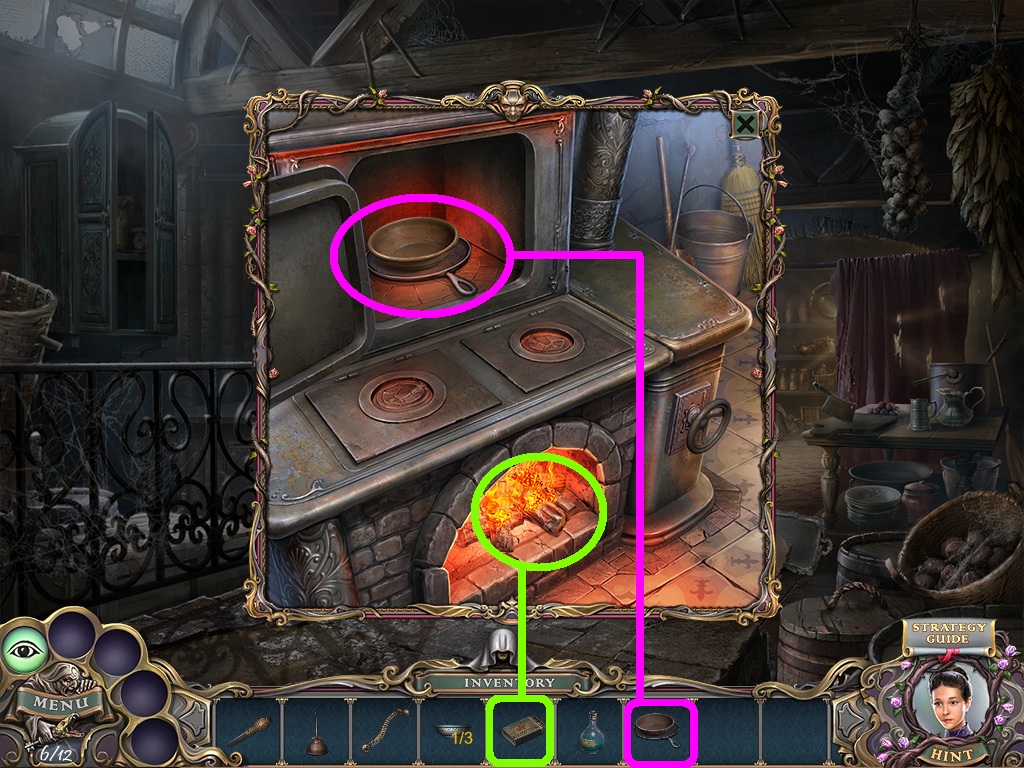 - Pick the clay pot (pink square) from the inventory; place it into the oven.