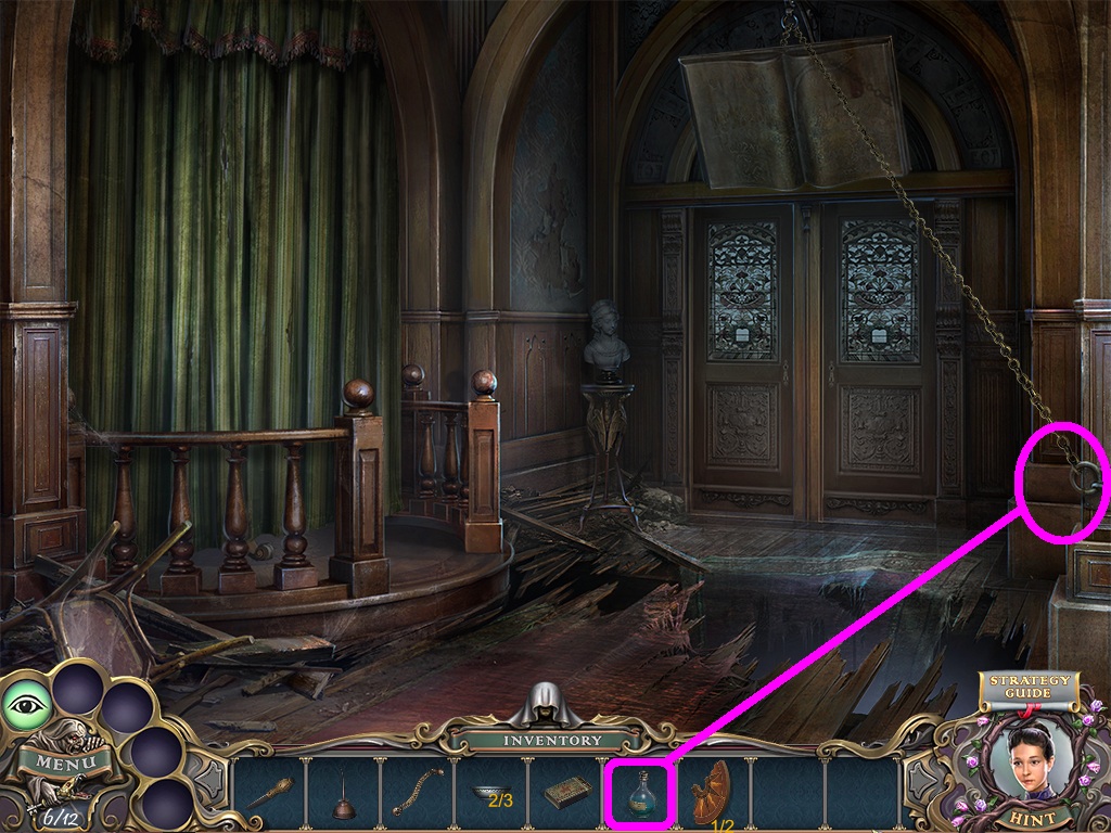 - Pick the acid (pink square) from the inventory; pour it onto the chain (pink circle).