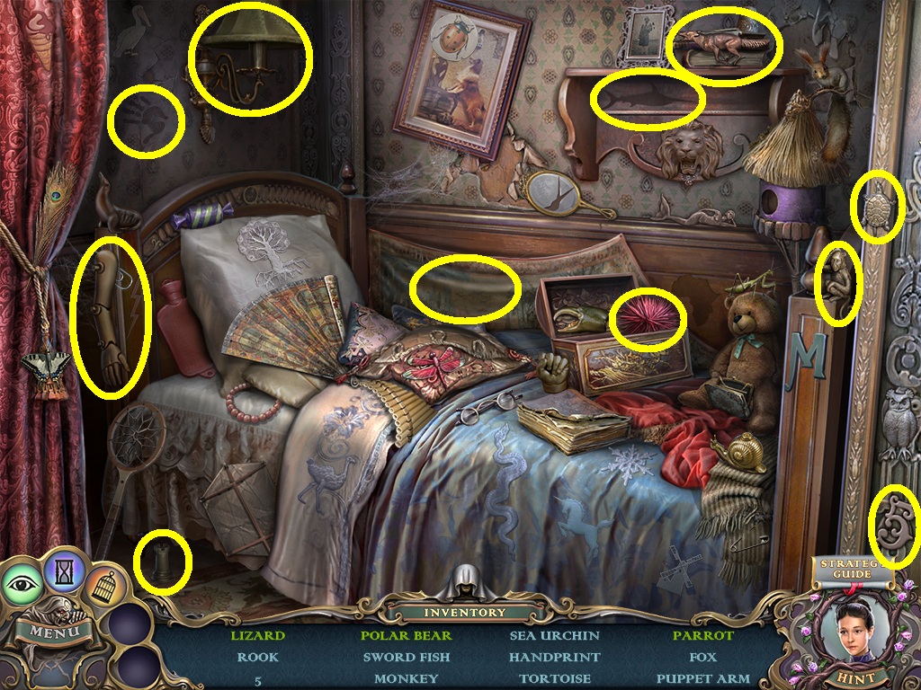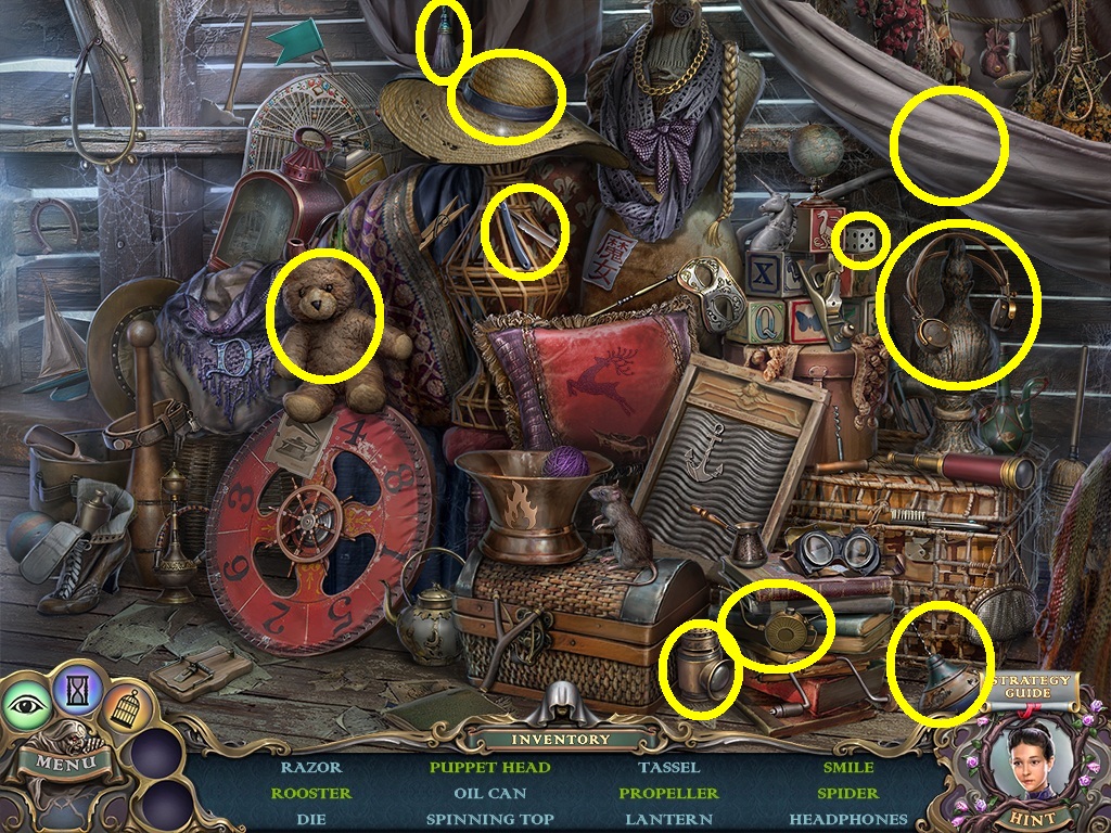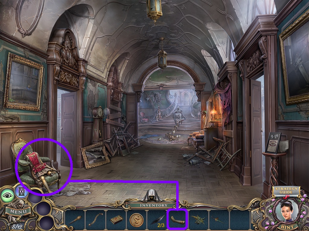 - Pick the puppet head (purple square) from the inventory; place it on the puppet (purple circle).