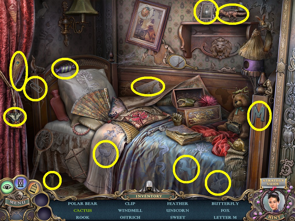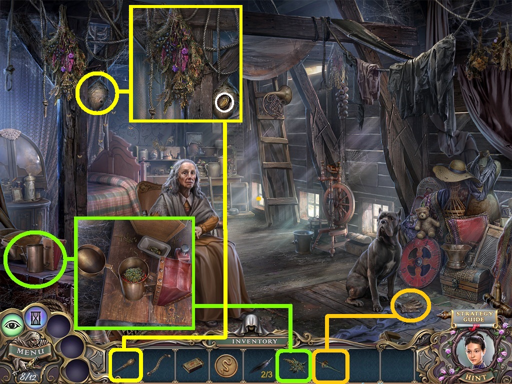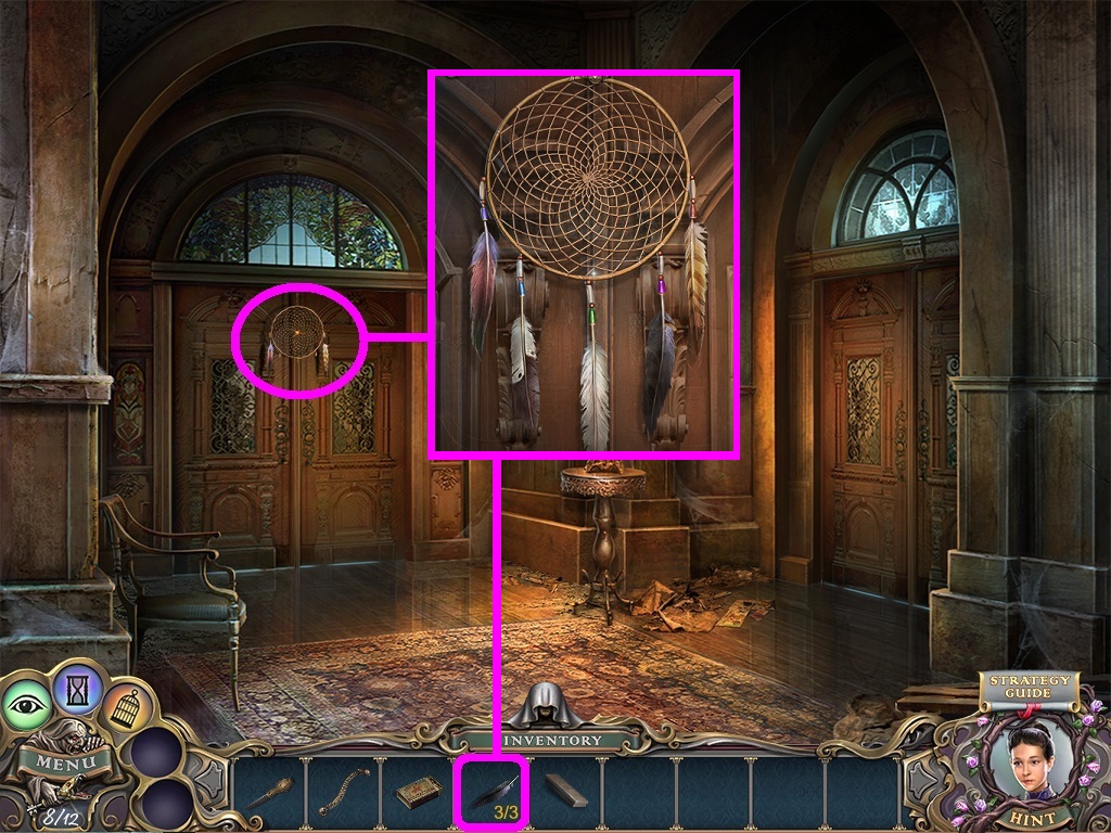 - Pick the feathers (pink square) from the inventory; place them into the dream catcher (pink circle).