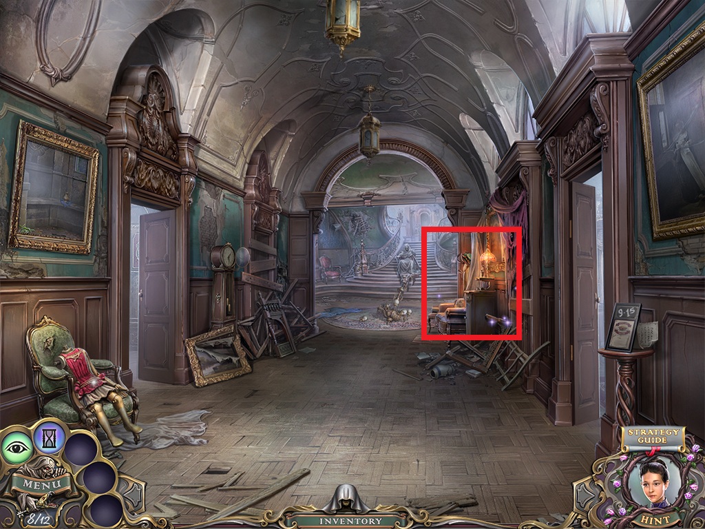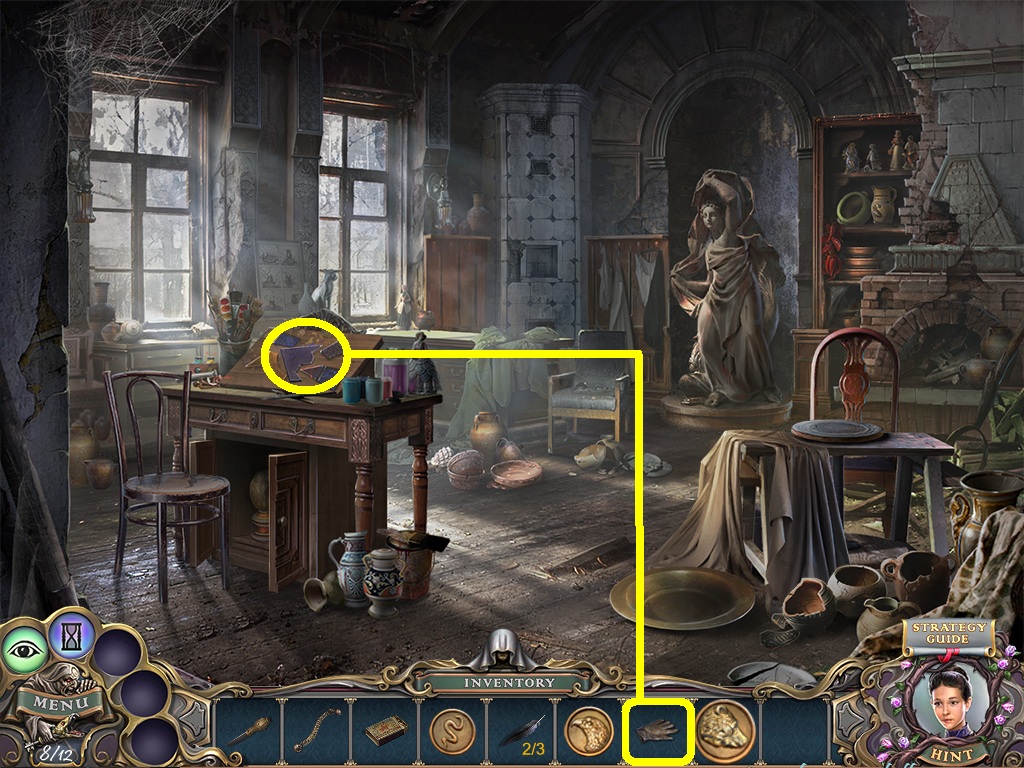 - Pick the glove (yellow square) from the inventory; use it to pick up the piece of stained glass (yellow circle).