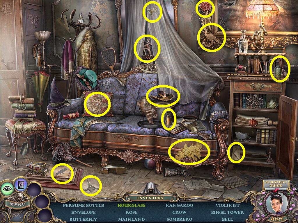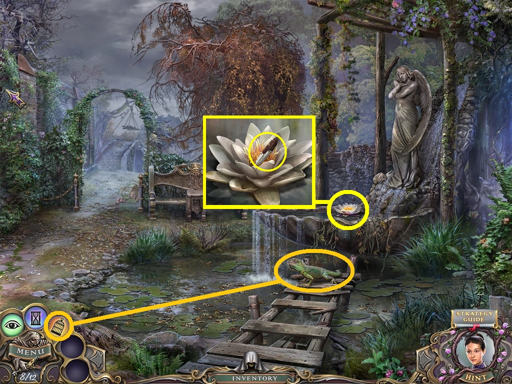 - Zoom into the fountain (yellow circle); collect the feather (yellow circle).