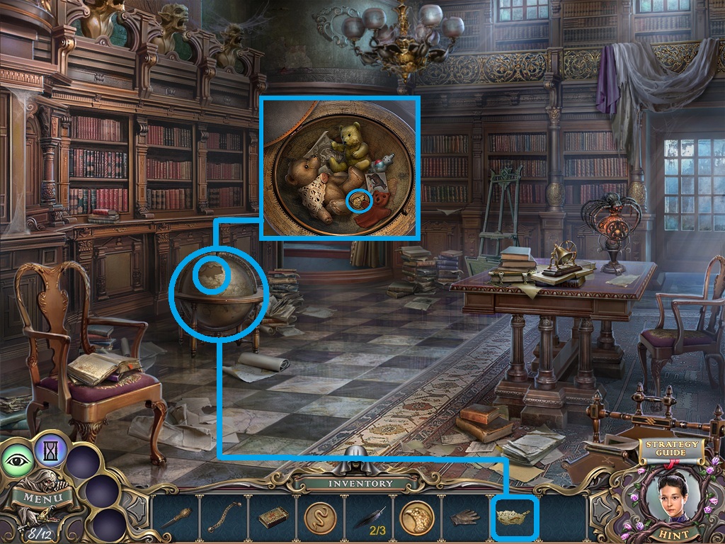 - Pick the piece of globe (blue square) from the inventory; place it into the missing space on the globe (blue circle).