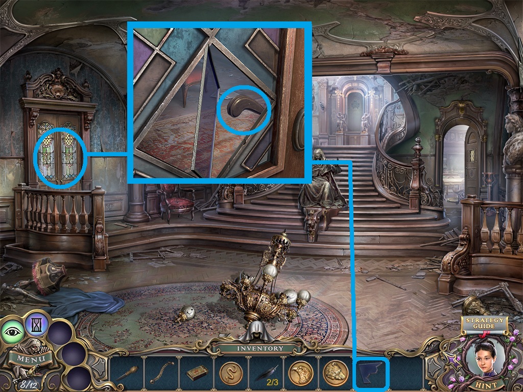 - Pick the stained glass piece (blue square) from the inventory; place it into the broken glass area.