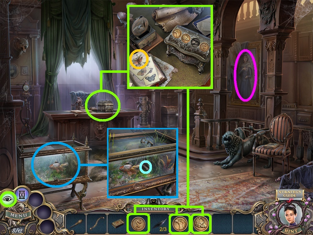 - Zoom into the fish tank (blue circle); pick the bait (blue square) from the inventory.