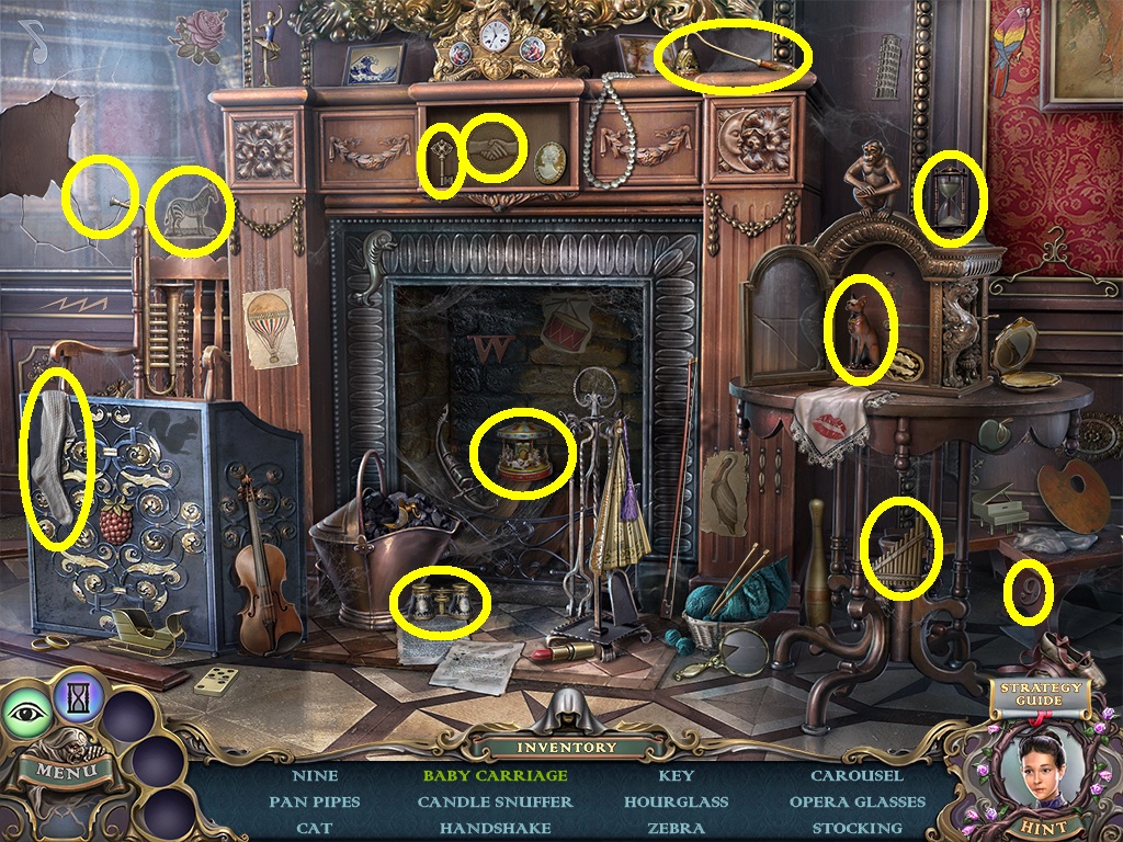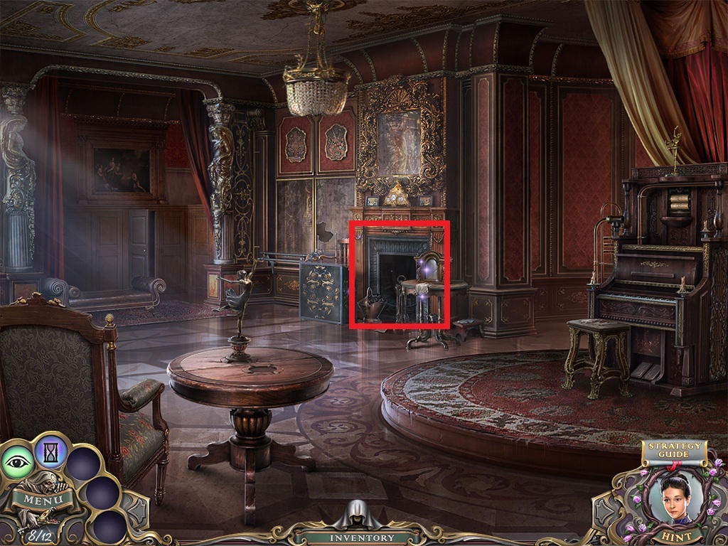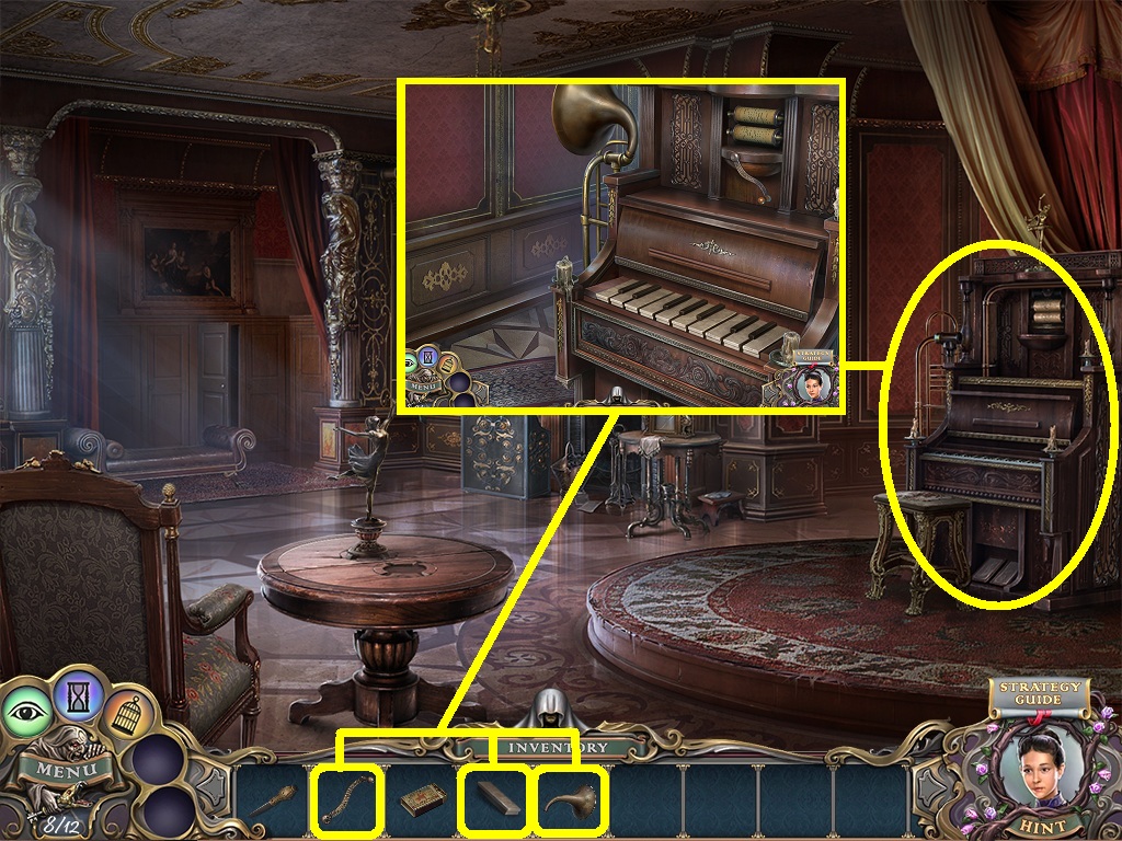 - Pick the trumpet, the piano key and handle (yellow squares) from the inventory; place them onto the piano.