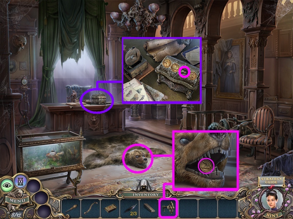 - Pick the medallions (green squares) from the inventory; insert them into the empty spaces.