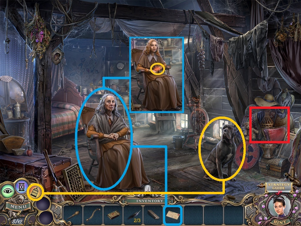 - Pick the letters (blue square) from the inventory; give them to the woman (blue circle).