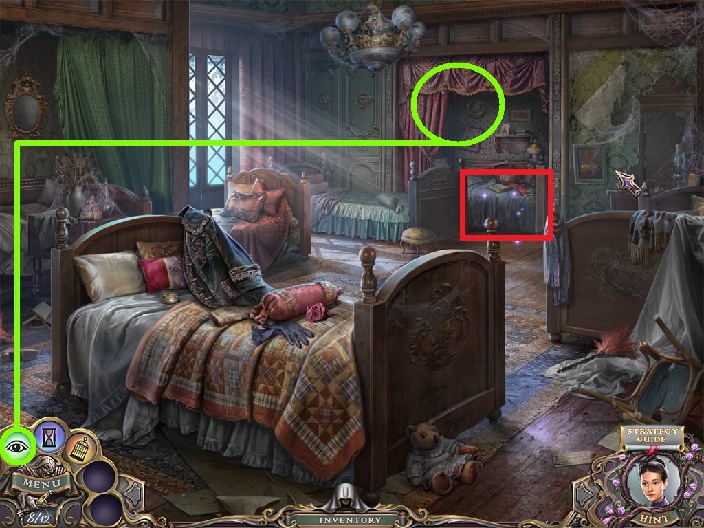 - Select the power of revelation (green circle) use it on the wall (green circle) to reveal the curtain.