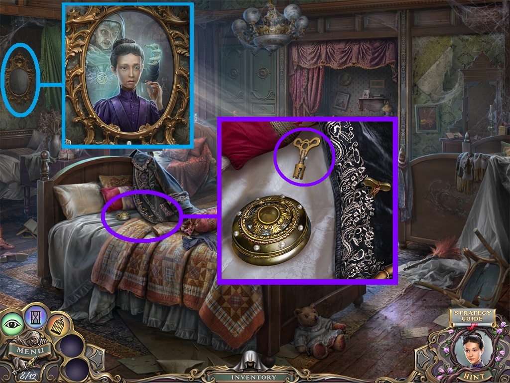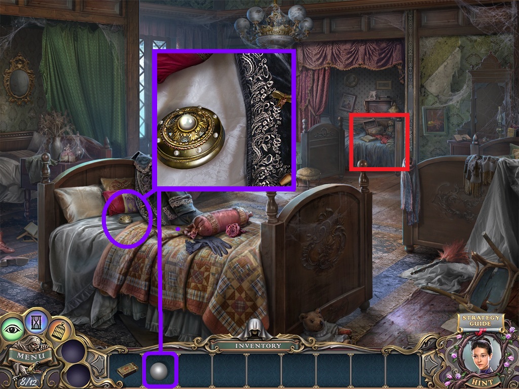 - Pick the pearl (purple square) from the inventory; place it into the case top.